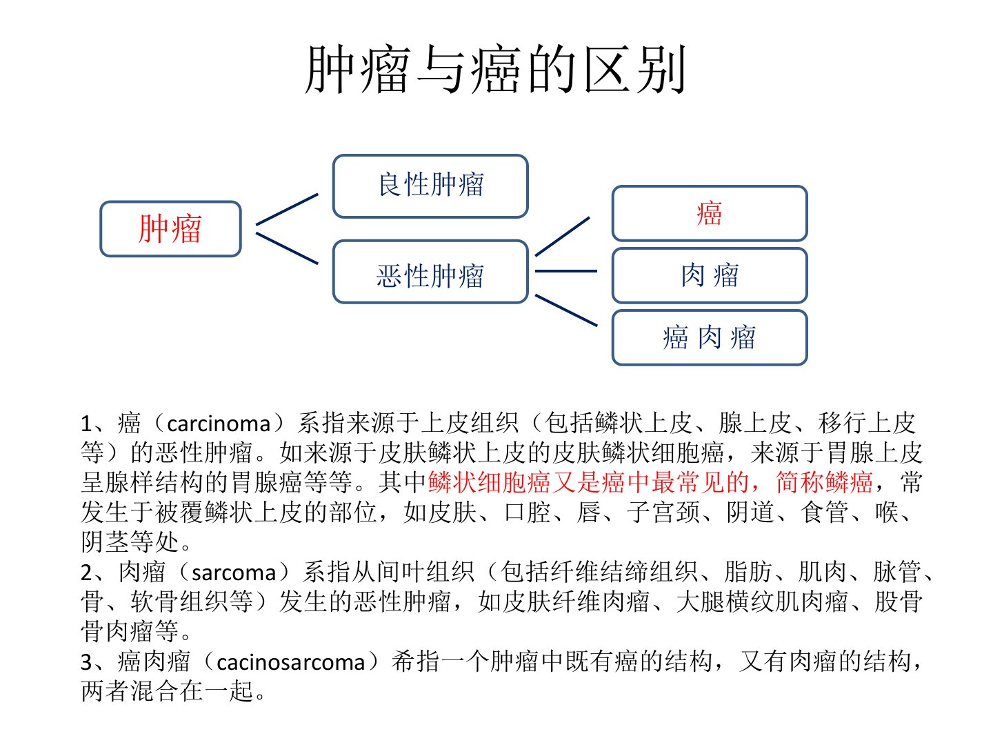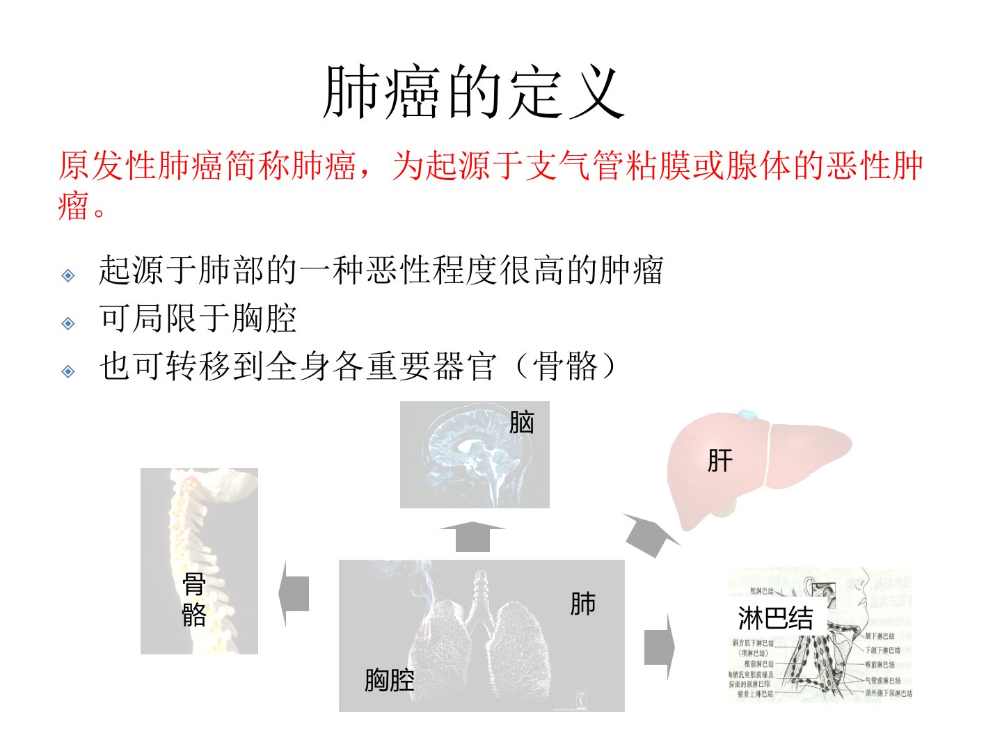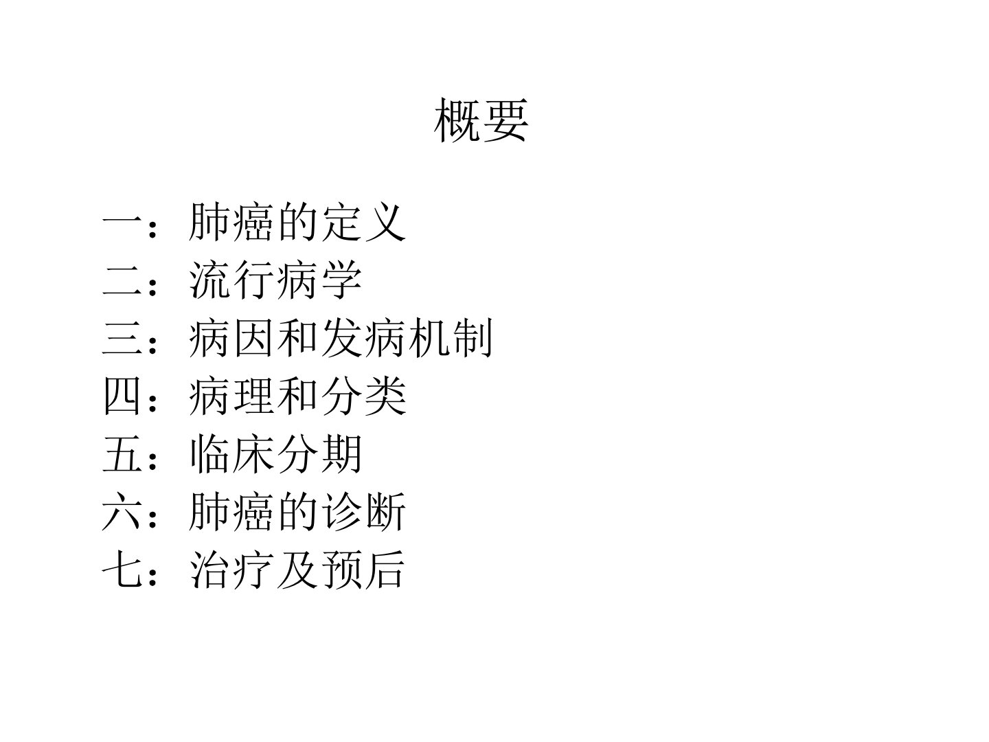 概要一:肺癌的定义二:流行病学三:病因和发病机制四:病理和分类五:临床分期六:肺癌的诊断七:治疗及预后肺癌的定义起源于肺部的一种恶性程度很高的肿瘤可局限于胸腔也可转移到全身各重要器官(骨骼)原发性肺癌简称肺癌,为起源于支气管粘膜或腺体的恶性肿瘤。肿瘤与癌的区别1、癌(carcinoma)系指来源于上皮组织(包括鳞状上皮、腺上皮、移行上皮等)的恶性肿瘤。如来源于皮肤鳞状上皮的皮肤鳞状细胞癌,来源于胃腺上皮呈腺样结构的胃腺癌等等。其中鳞状细胞癌又是癌中最常见的,简称鳞癌,常发生于被覆鳞状上皮的部位,如皮肤、口腔、唇、子宫颈、阴道、食管、喉、阴茎等处。 2、肉瘤(sarcoma)系指从间叶组织(包括...