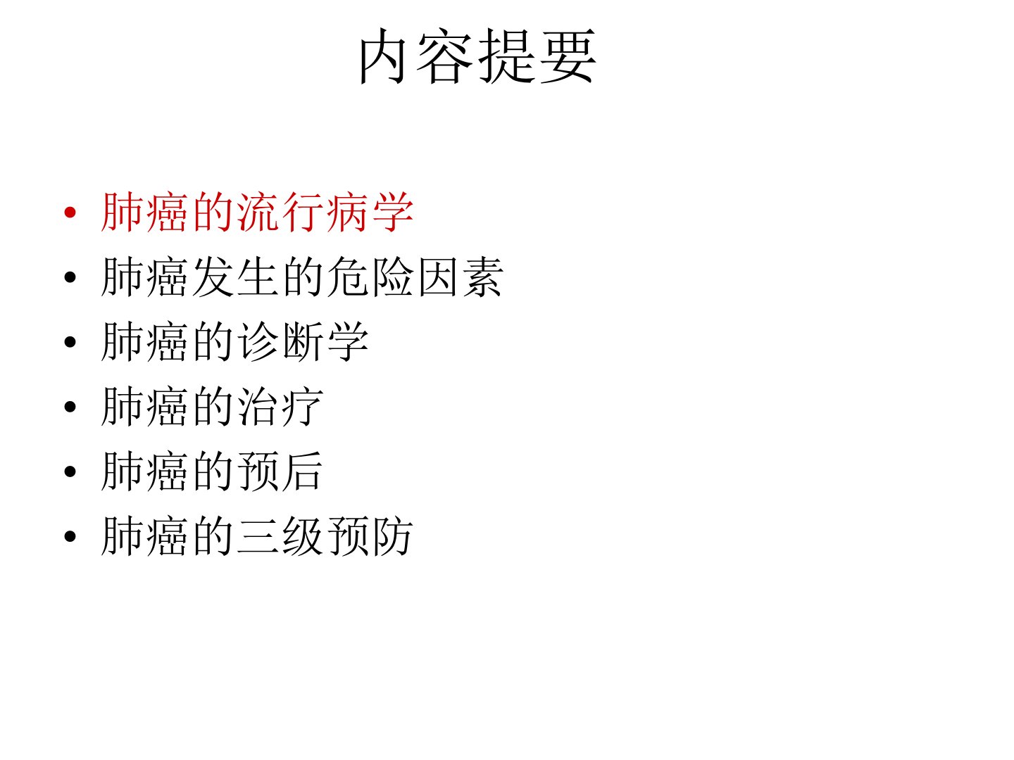 作为医生现就肺癌相关要点总结如下:1流行病学:欧美国家控烟后肺癌发病率下降而中国发病率和死亡率呈上升趋势。2危险因素:包括内因(基因易感性、免疫力)和外因(吸烟、空气污染、辐射、矿物暴露、感染等)。吸烟或被动吸烟使患肺癌机会大增吸烟指数400被定义为高危人群。3诊断:包括临床诊断(病史、症状、体征及影像学、实验室检查)和病理诊断(金标准)。肺癌分类包括非小细胞肺癌(75)和小细胞肺癌(20)等并有详细分期。4治疗:采用综合治疗模式早期以手术为主局部晚期以放化疗为主晚期以全身治疗为主终末期以姑息治疗为主。5预后:肺癌自然病程短发展迅速晚期预后差IV期非小细胞肺癌和小细胞癌患者中位生存期分别仅1214个月和910个月。6三级预防:包括控烟、改善环境等一级预防;低剂量CT早期诊断等二级预防;以及综合治疗防止复发转移、注重康复等三级预防。