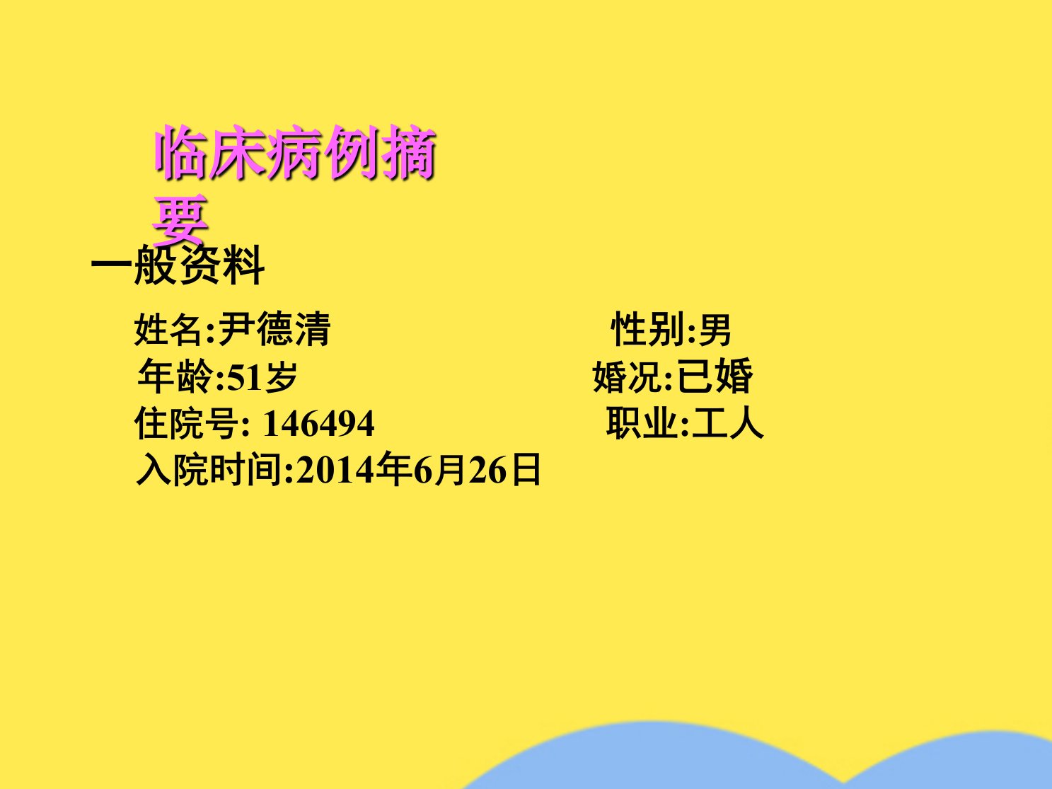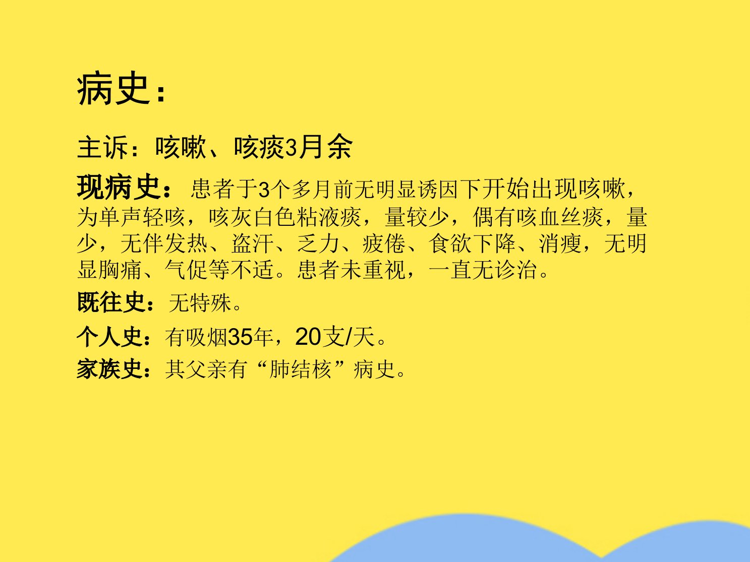 肺癌教学查房临床病例摘要一般资料姓名:尹德清性别:男年龄:51岁婚况:已婚住院号:146494职业:工人入院时间:2014年6月26日病史:主诉:咳嗽、咳痰3月余现病史:患者于3个多月前无明显诱因下开始出现咳嗽,为单声轻咳,咳灰白色粘液痰,量较少,偶有咳血丝痰,量少,无伴发热、盗汗、乏力、疲倦、食欲下降、消瘦,无明显胸痛、气促等不适。患者未重视,一直无诊治。既往史:无特殊。个人史:有吸烟35年,20支/天。家族史:其父亲有“肺结核”病史。体查:全身浅表淋巴结未触及肿大,气管居中,呼吸运动对称,肋间隙正常,语颤正常,双肺叩诊清音,双肺呼吸音粗,未闻及干湿啰音。HR70次/分,律齐,未闻及病理性杂...