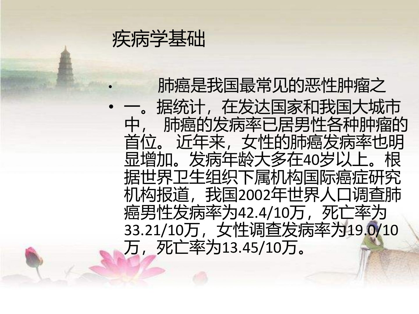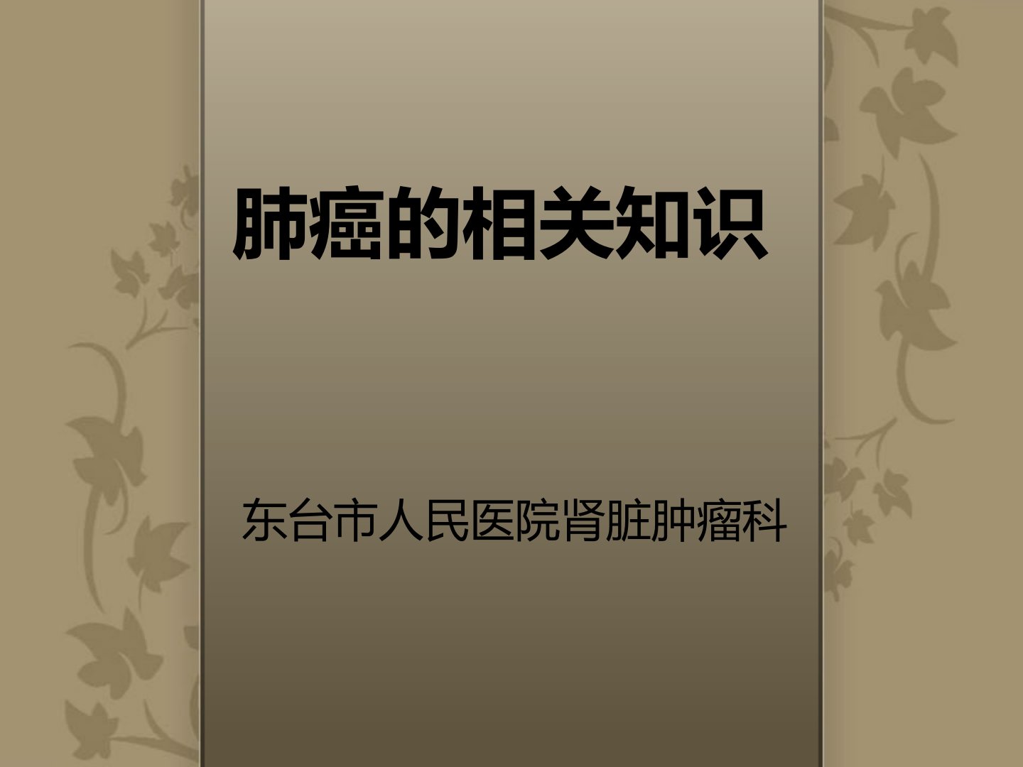 肺癌的相关知识东台市人民医院肾脏肿瘤科疾病学基础肺癌是我国最常见的恶性肿瘤之一。据统计,在发达国家和我国大城市中,肺癌的发病率已居男性各种肿瘤的首位。近年来,女性的肺癌发病率也明显增加。发病年龄大多在40岁以上。根据世界卫生组织下属机构国际癌症研究机构报道,我国2002年世界人口调查肺癌男性发病率为42.4/10万,死亡率为33.21/10万,女性调查发病率为19.0/10万,死亡率为13.45/10万。肺的基本结构左肺上叶左肺下叶右肺上叶右肺中叶右肺下叶(一)病因及危险因素肺癌的病因至今尚不明确,但研究发现许多因素与肺癌的发生有关,主要的危险因素包括:1、吸烟各类统计研究发现,长期大量吸烟是...