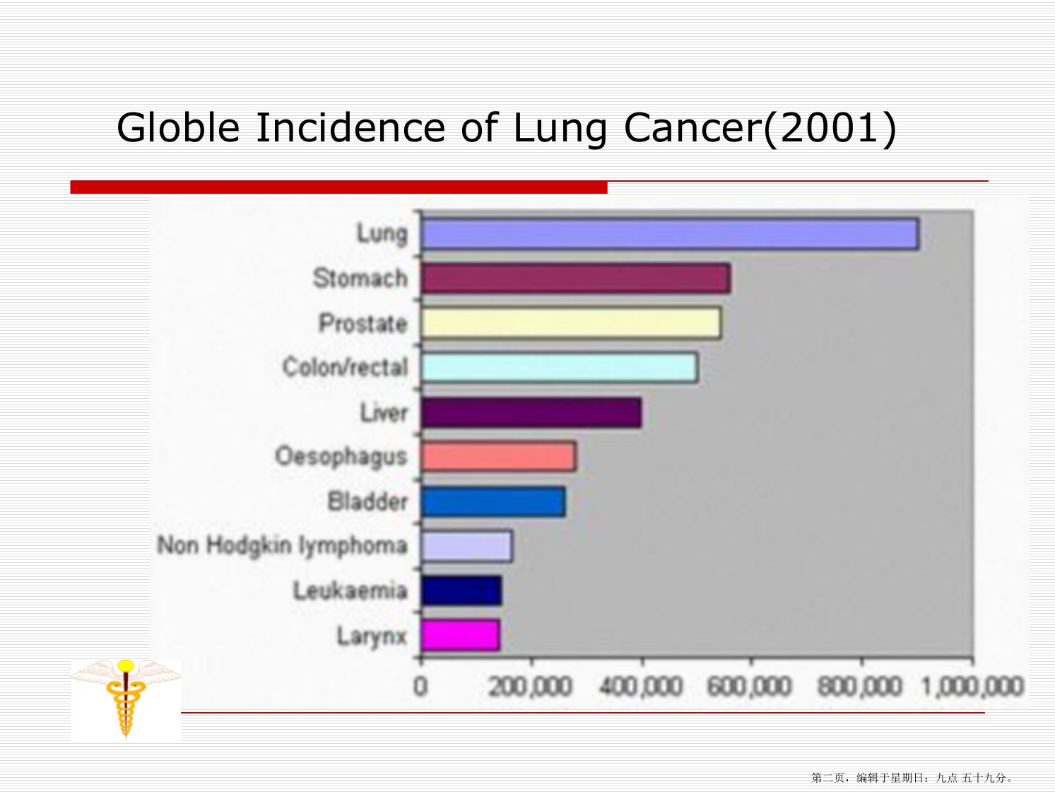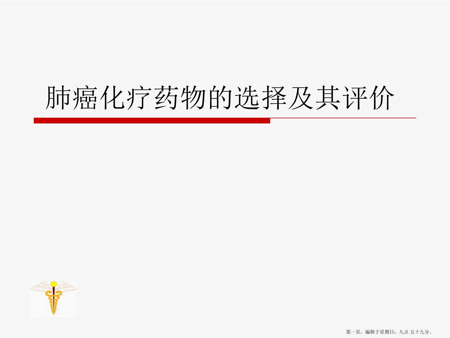 肺癌化疗药物的选择及其评价第一页,编辑于星期日:九点五十九分。GlobleIncidenceofLungCancer(2001)第二页,编辑于星期日:九点五十九分。第三页,编辑于星期日:九点五十九分。初诊肺癌分期第四页,编辑于星期日:九点五十九分。主要内容肺癌知识概述化疗药物的发展和选择化疗实施方案结论第五页,编辑于星期日:九点五十九分。肺癌概述第六页,编辑于星期日:九点五十九分。研究热点早期发现,早期诊断,早期治疗----二级预防晚期肺癌非手术化疗为主综合治疗第七页,编辑于星期日:九点五十九分。肺癌临床特点、分期SCLC和NSCLC在生物学行为、肿瘤标志、临床特征、癌细胞抗原性、以及对放、化...