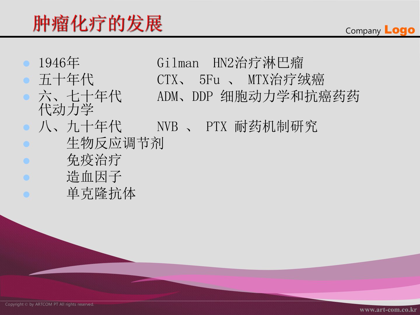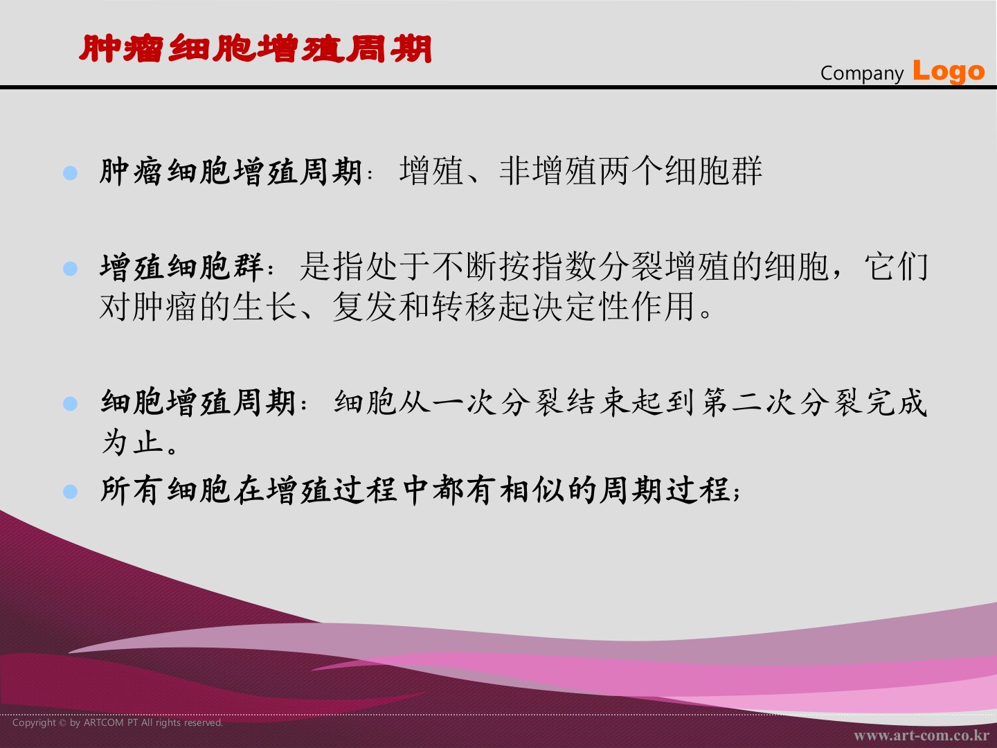 肺癌化疗及靶向治疗1946年GilmanHN2治疗淋巴瘤五十年代CTX、5Fu、MTX治疗绒癌六、七十年代ADM、DDP细胞动力学和抗癌药药代动力学八、九十年代NVB、PTX耐药机制研究生物反应调节剂免疫治疗造血因子单克隆抗体肿瘤化疗的发展肿瘤细胞增殖周期肿瘤细胞增殖周期:增殖、非增殖两个细胞群增殖细胞群:是指处于不断按指数分裂增殖的细胞,它们对肿瘤的生长、复发和转移起决定性作用。细胞增殖周期:细胞从一次分裂结束起到第二次分裂完成为止。所有细胞在增殖过程中都有相似的周期过程;细胞增殖周期分为四期肿瘤细胞的增殖动力学SDNA合成期G2合成后期M分裂期无增殖力细胞G0静止期G1合成前期细胞动力学分...