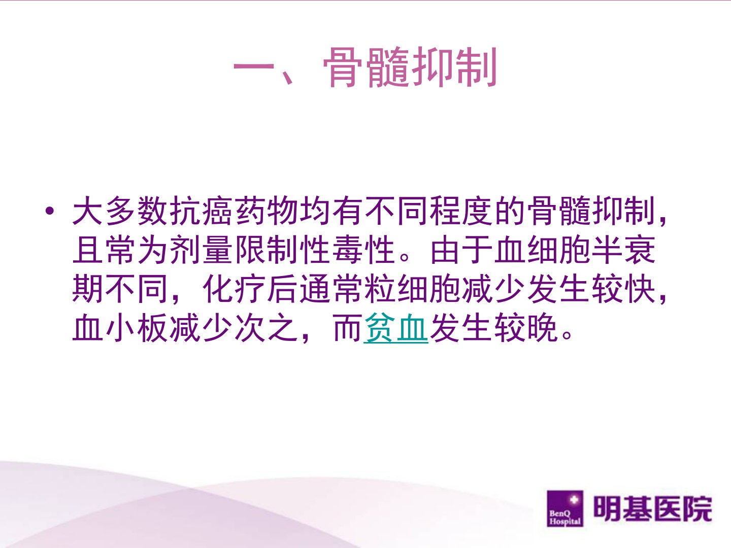 肺癌化疗副作用的处理前言近几十年来,随着新的抗癌药物的不断研制,肿瘤化疗的广泛应用,疗效有了较大的改善。但是,目有临床使用的抗癌药物的选择性不高,敌我不分,在杀伤肿瘤细胞的同时对机体正常细胞,特别是增殖旺盛的细胞具有损害作用。成为限制用量、阻碍疗效发挥的主要问题。因此,尽早地预测毒副反应并及时进行有效的处理,对于保证顺利完成治疗及提高长期生活质量是至关重要的。贫血除长春新碱、博莱霉素、左旋门冬酰胺酶外,大多数抗癌药对白细胞影响较大,并且出现的早晚和持续的时间不同,如氮芥、环磷酰胺等表现为近期毒性作用,大剂量冲击治疗时停药后3~4天白细胞开始下降。有些药物如长春花碱、甲氨喋呤、羟基脲等,则多在用...