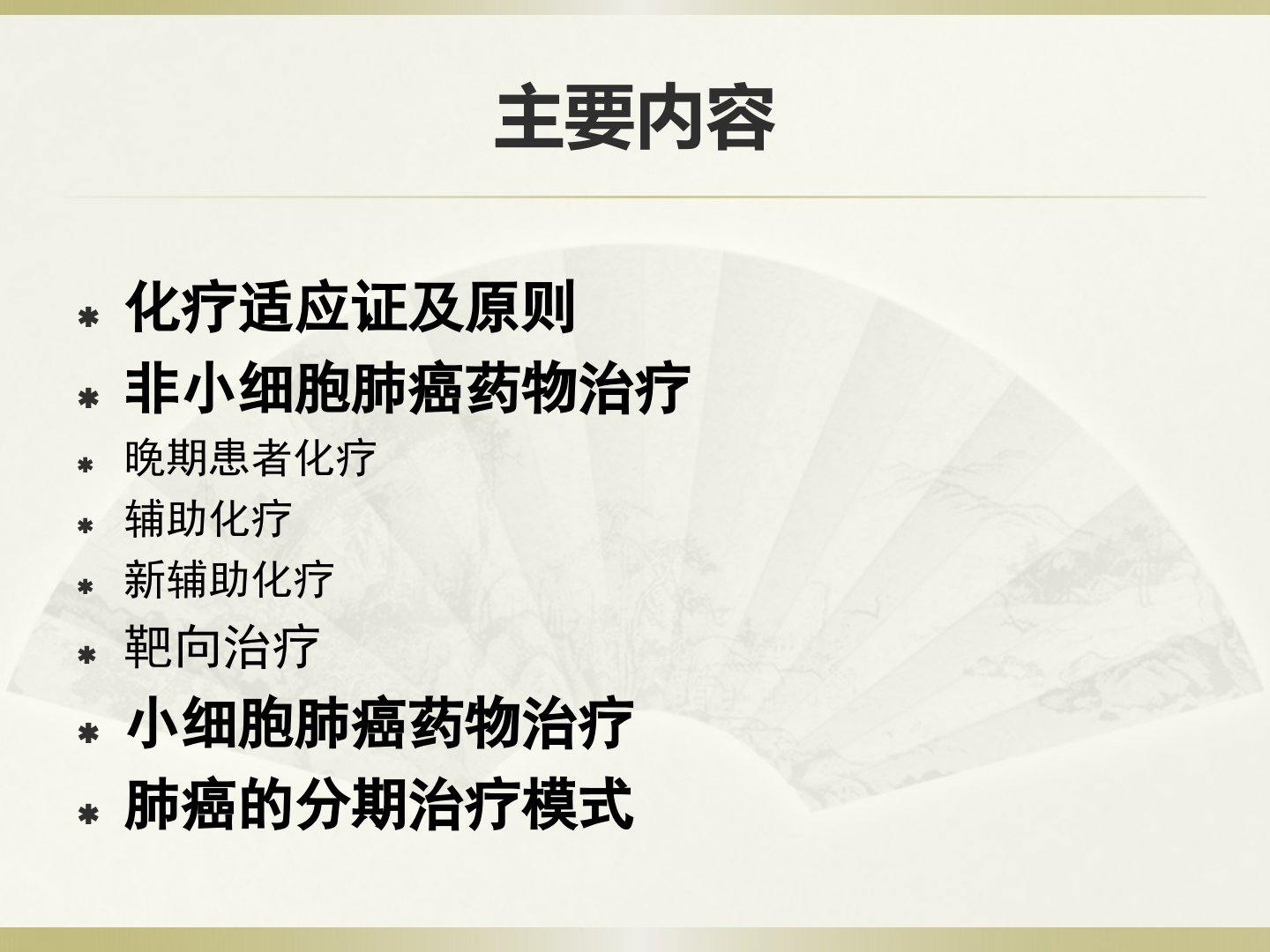 肺癌的药物治疗和分期治疗模式安徽医科大学第一附属医院肿瘤科顾康生主要内容化疗适应证及原则非小细胞肺癌药物治疗晚期患者化疗辅助化疗新辅助化疗靶向治疗小细胞肺癌药物治疗肺癌的分期治疗模式化疗适应证及原则化疗的适应证美国东部肿瘤协作组(ECOG)体力状况(PS)评分≤2分或(KPS)>60分。重要脏器功能可耐受化疗。对于SCLC的化疗,PS评分可放宽到3分。鼓励患者参加临床试验。Karnofsky评分法Zubrod-ECOG-WHO(ZPS,5分法)化疗的原则KPS功能状态评分2分的患者不宜进行化疗。白细胞在化疗过程中,如果出现以下情况应当考虑停药或更换方案:治疗2个周期后病变进展,或在化疗周期的休...