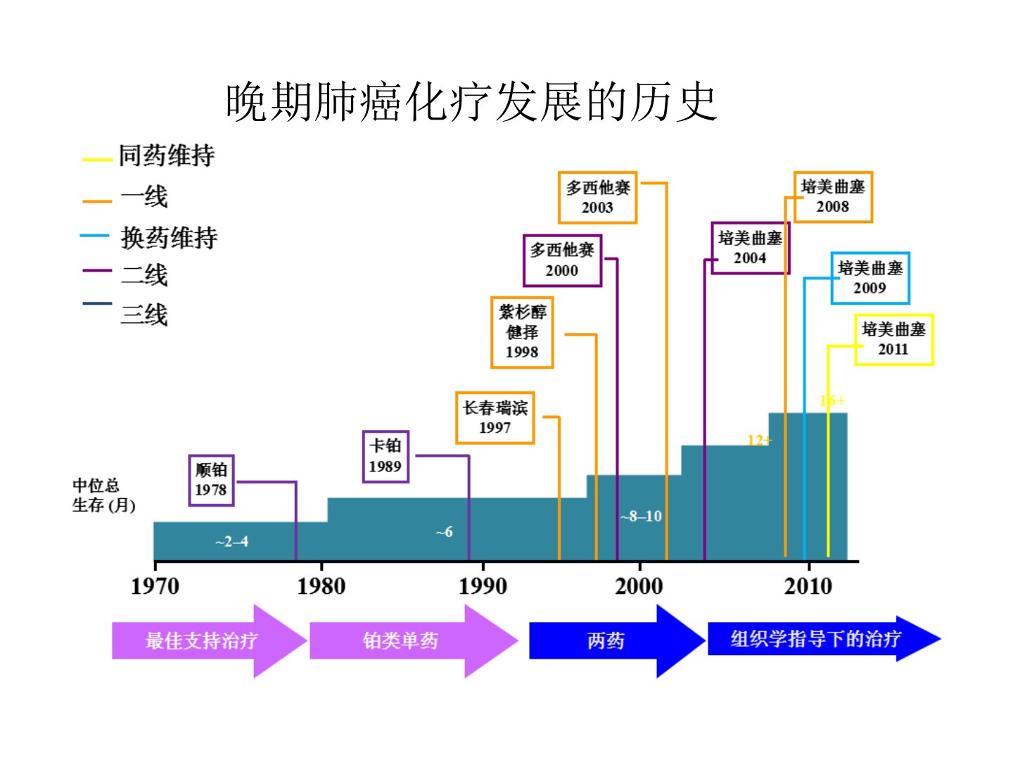晚期肺癌化疗发展历史中抗肿瘤药物依据作用机制可分为四大类:影响核酸生物合成的药物、影响DNA结构与功能的药物、干扰转录及RNA合成的药物、抑制蛋白合成与功能的药物。这些药物根据细胞周期特异性又分为仅对增殖期某些时相敏感的药物和能杀灭增殖周期各时相及G0期细胞的药物其中G0期细胞常为肿瘤复发根源。常见化疗方案包括多西他赛、培美曲塞等联合铂类药物。吉西他滨进入肿瘤细胞后代谢为活性三磷酸盐整合到DNA中阻断细胞周期激活P53依赖性途径。紫杉醇是微管稳定剂阻碍有丝分裂与顺铂联用时需注意清除率问题。长春瑞滨加强微管蛋白聚合多西紫杉醇为抗叶酸制剂培美曲塞需预处理以降低毒性。顺铂、卡铂等铂类药物有不同用法用量及副反应奈达铂作用于DNA拓扑异构酶II依托泊苷、伊立替康则与拓扑异构酶结合引起DNA断裂。