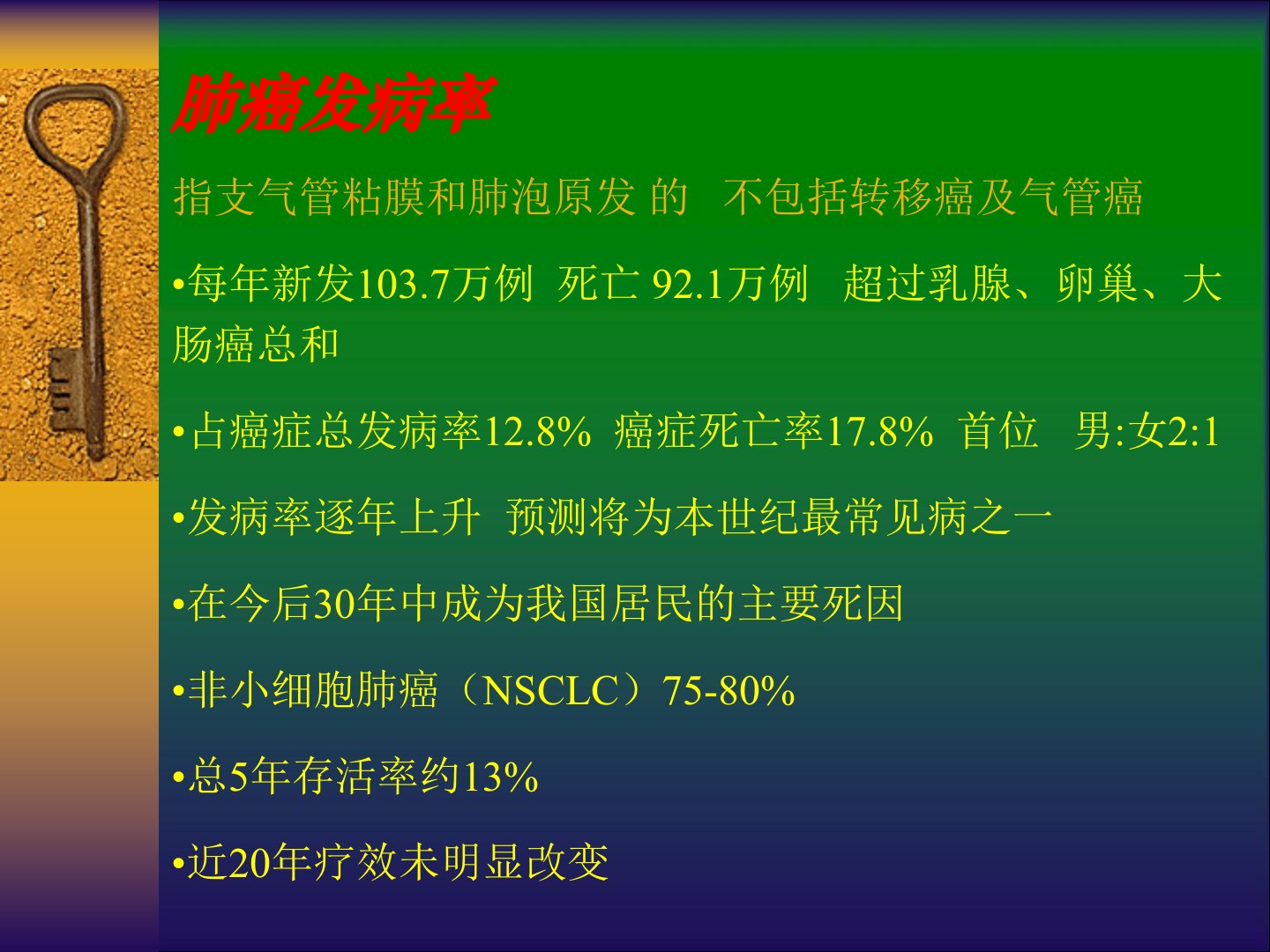 肺癌的放射治疗ppt课件(9)肺癌发病率指支气管粘膜和肺泡原发的不包括转移癌及气管癌每年新发103.7万例死亡92.1万例超过乳腺、卵巢、大肠癌总和占癌症总发病率12.8%癌症死亡率17.8%首位男:女2:1发病率逐年上升预测将为本世纪最常见病之一在今后30年中成为我国居民的主要死因非小细胞肺癌(NSCLC)75-80%总5年存活率约13%近20年疗效未明显改变癌症发病率癌症死亡率女性癌症死亡率1.2浸润癌前病变1.2.1鳞状上皮不典型增生/原位癌1.3恶性1.3.1鳞状细胞癌30%1.3.2小细胞癌18.2%1.3.3腺癌30.7%1.3.4大细胞癌9.4%1.3.5腺鳞癌1.5%1.3.6...