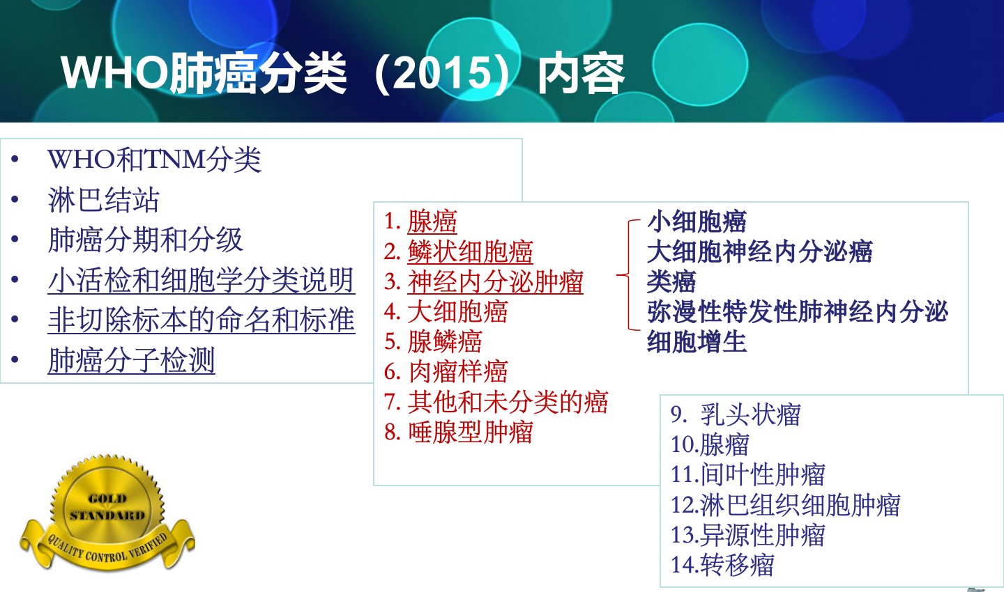 肺癌病理诊断和分子分型临床讲座摘要本次讲座聚焦肺癌病理诊断与分子分型。诊断执行有明确标准涵盖执业医师法、病理学操作规范、病理科建设指南及肿瘤病理规范化诊断标准等同时参考WHO肺癌分类(2015)。肺癌分类包括腺癌、鳞状细胞癌、神经内分泌肿瘤等多种类型各类型有不同亚型、分级及鉴别诊断要点。分子检测对肺癌精准治疗意义重大。亚裔肺腺癌患者个体化治疗成趋势驱动基因明确且有靶向抑制剂从单纯化疗到靶向治疗显著延长晚期NSCLC患者OS。分子检测指南明确了检测对象、时机、内容及标本等要求推荐同时检测EGFR、ALK等检测方法获CFDA批准的优先血液ctDNA检测可作补充。病理医师工作需精细晚期患者标本有限临床医师应提供详细资料。标本固定要及时准确不同标本有相应固定标准。ALK阳性NSCLC有多种诊断方法任一阳性即可诊断普通免疫组化只能初筛。讲座还提及本院检测情况强调多学科协作对提高肺癌诊疗水平的重要性并就建立Alk检测平台的必要性与困难展开讨论。