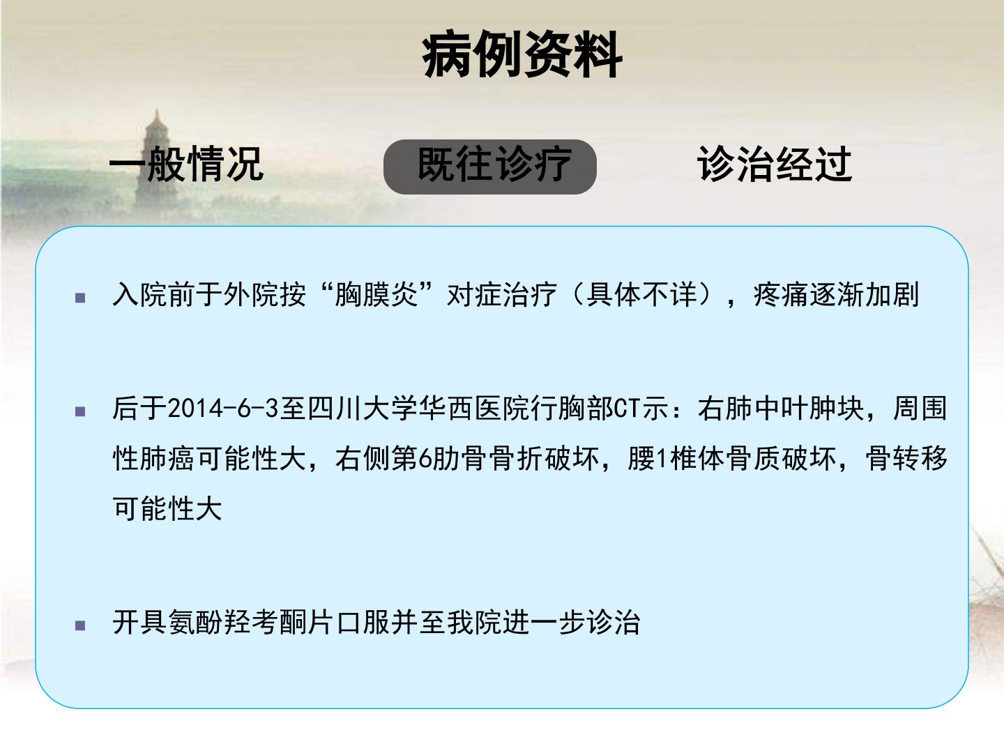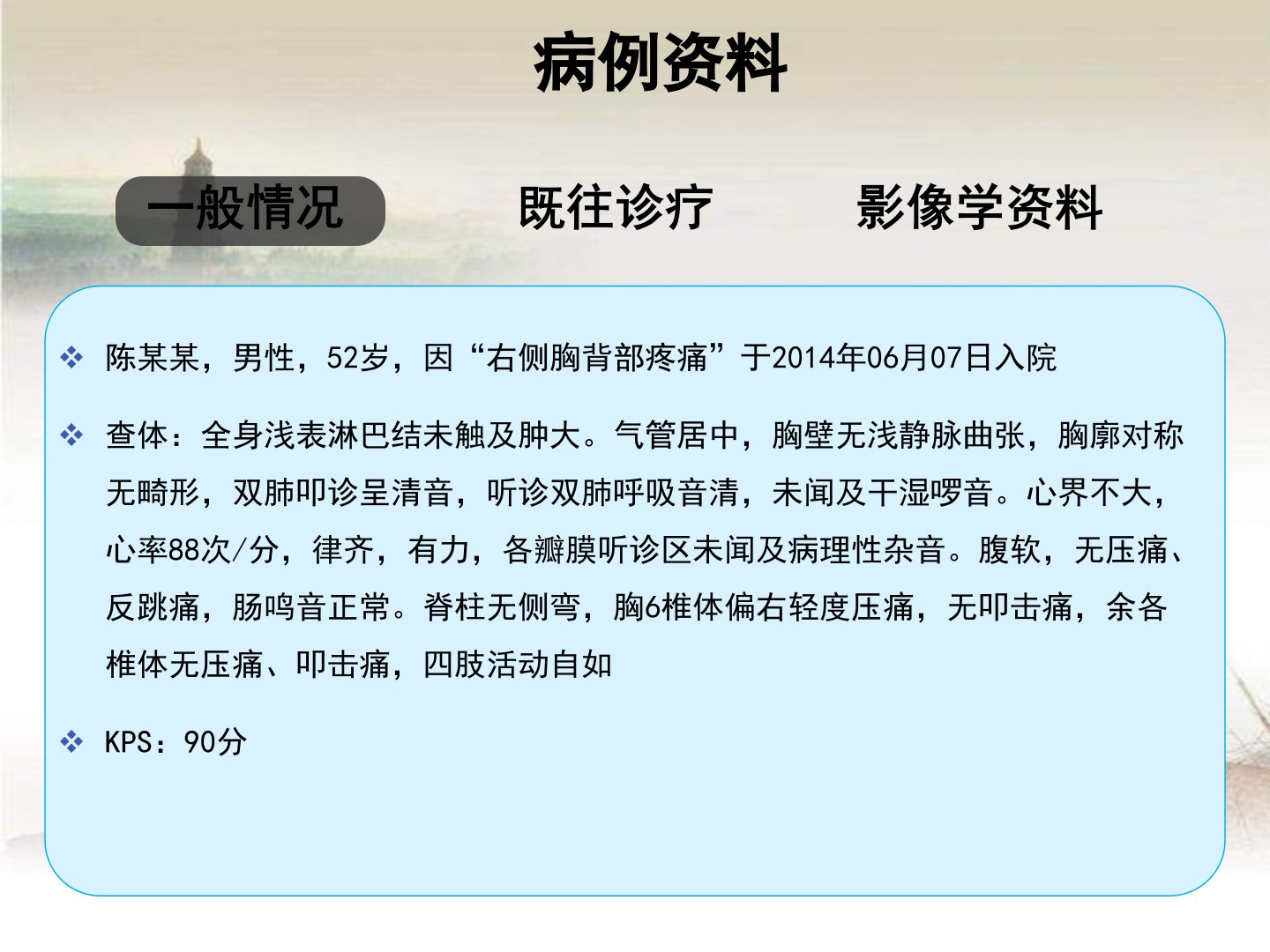 一例晚期NSCLC的诊治过程与思考摘要52岁男性陈某某因“右侧胸背部疼痛”入院此前被误诊为“胸膜炎”并治疗后疼痛加剧经检查确诊为右肺中叶腺癌伴全身多处骨转移。诊治过程分三阶段:第一阶段止痛并明确诊断通过各项检查确诊病情;第二阶段同步放化疗采用TP方案化疗5周期并对右第6肋骨转移部位和右肺中叶肿瘤进行放疗;第三阶段靶向治疗维持因EGFR基因检测呈19Del突变口服特罗凯治疗。针对EGFR敏感突变患者治疗有诸多思考如一线or二线治疗选择多项研究奠定TKI在EGFR基因突变阳性患者中一线治疗地位但一线TKI可能降低后续化疗敏感性也存在让患者错过化疗机会的争议。不过支持一线使用EGFRTKI的数据显示其耐受性良好、能提高患者生活质量、降低脑转移发生率。对于晚期NSCLC应常规进行EGFR基因突变和ALK基因检测据此制定治疗策略明确EGFR基因突变阳性患者推荐EGFRTKI一线治疗。同时思考了化疗期间检测出EGFR突变的治疗方式强调肺癌综合治疗应以明确靶点为基础综合应用多种手段优化药物疗效制定个体化方案。