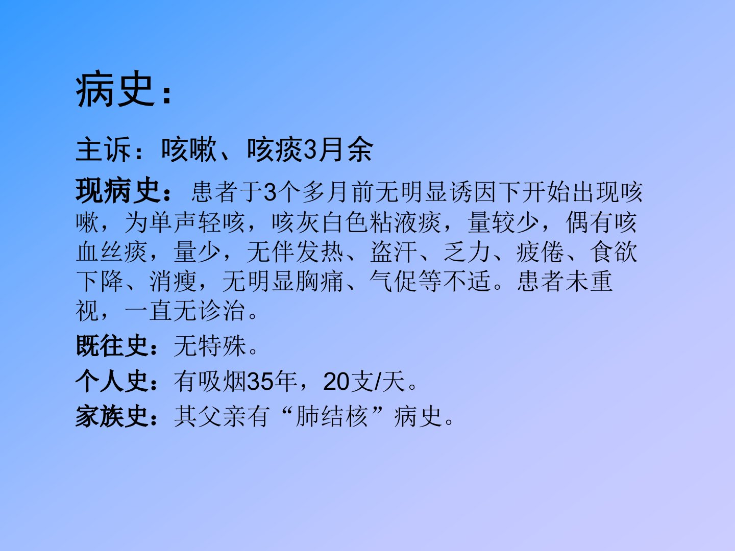 患者尹德清51岁男性工人有35年吸烟史因持续3月余的咳嗽、咳痰(偶有血丝)入院无发热、胸痛等症状其父有肺结核史。入院检查胸片初判为肺炎但抗感染治疗无效。复查胸片及CT显示右肺门下方有不规则软组织密度影伴肺不张及纵隔淋巴结肿大高度怀疑肺部肿瘤。后经支气管镜及病理活检确诊为右肺低中分化鳞状细胞癌。肺癌为起源于支气管黏膜或腺体的恶性肿瘤危险因素包括吸烟、职业致癌因子、空气污染等。临床表现与肿瘤大小、类型等密切相关可分为原发肿瘤、肺外胸内扩展、胸外转移引起的症状及胸外表现四类。诊断依赖临床表现、影像学检查及病理结果其中病理检查为金标准。本例患者经全面检查后排除肺炎、肺门淋巴结结核、纵隔淋巴瘤、肺部良性肿瘤最终确诊肺癌。治疗依肿瘤组织学决定小细胞肺癌多依赖化疗非小细胞肺癌早期可手术。此外肺癌的免疫治疗为研究热点如抑制PDL1或PD1对NSCLC治疗有效。本次查房强调了全面问诊、细致体检及正确临床思维的重要性。