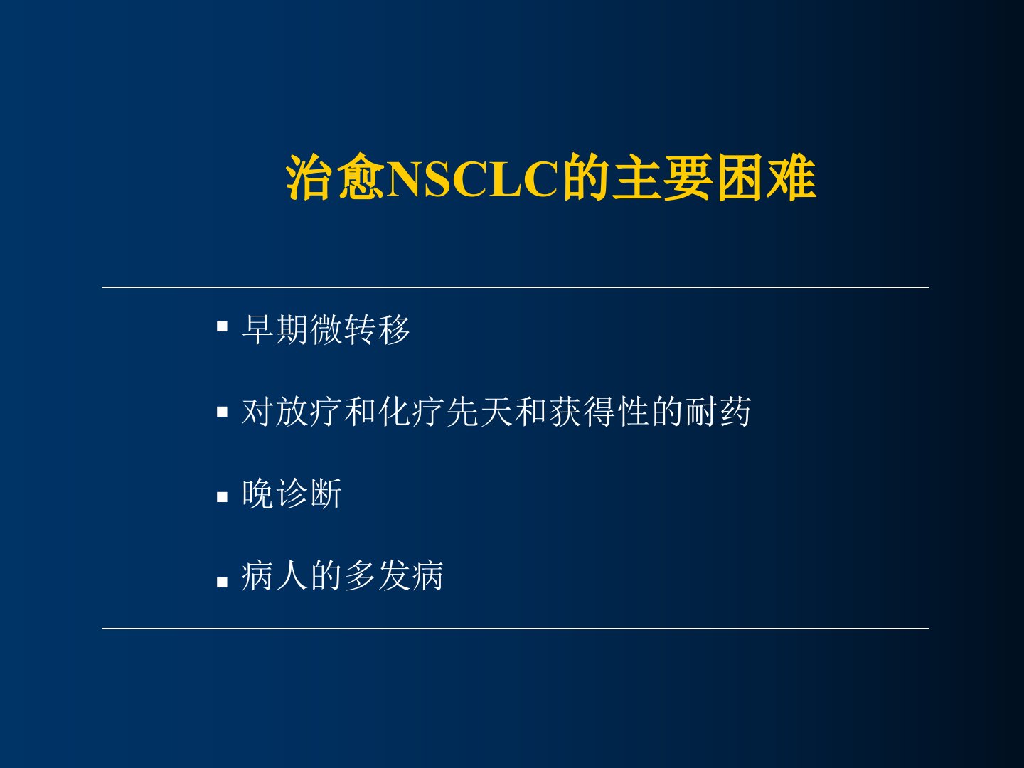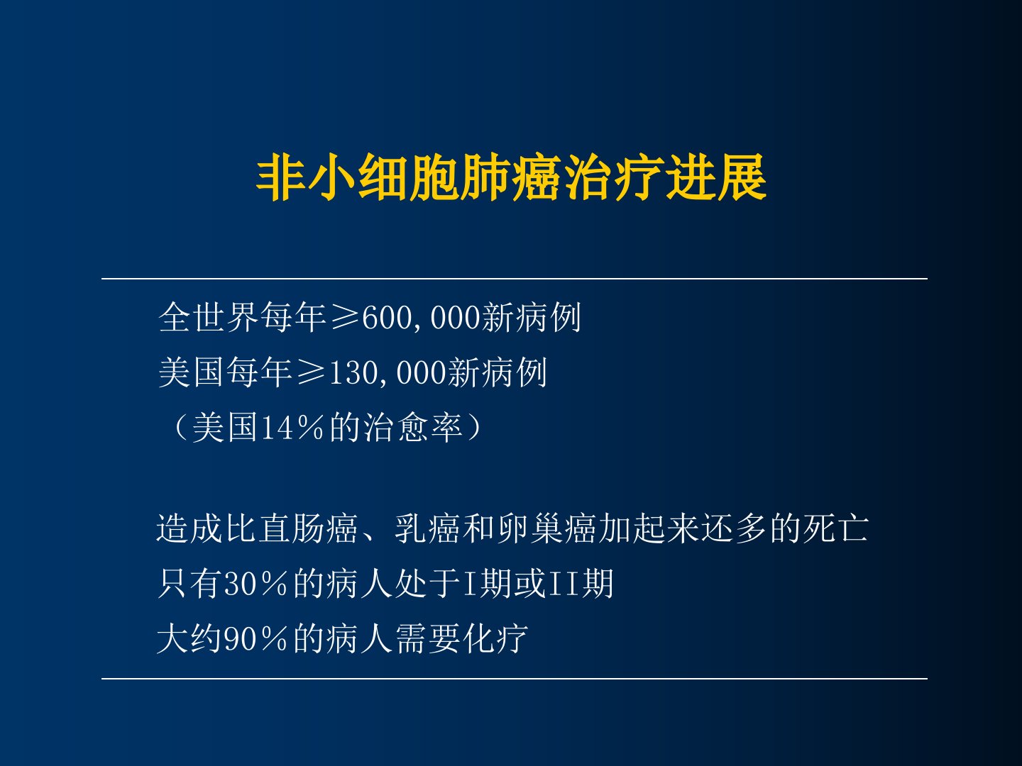 全球每年新发非小细胞肺癌(NSCLC)病例60万例其中美国13万例死亡率高于直肠癌、乳癌和卵巢癌的总和。NSCLC治疗面临早期微转移、先天和获得性耐药以及晚期诊断等多重挑战。根据新的国际修订分期NSCLC分为0到IV期不同分期的五年生存率差异显著。治疗原则包括手术、化疗或化疗联合放疗。初期化疗可提高治愈率辅助化疗延长存活率姑息化疗用于疾病晚期。多种新的化疗方案在转移性NSCLC治疗中显示出提高缓解率及生存的效果。对于III期NSCLC新辅助治疗可消除微转移、减小瘤体提高整体存活率。与术后辅助化疗相比新辅助化疗具有更好的患者接受性和耐受性。研究显示手术前的新辅助化疗可提高可手术III期NSCLC的存活率手术后辅助化疗可延长存活时间。在不能手术的III期NSCLC中系统的化疗可以减少远处转移比起单用放疗能延长存活时间。泰素由于具有潜在的放疗增敏作用通常被选择与放疗结合治疗局部晚期NSCLC。ECOG5592研究显示泰素联合顺铂治疗NSCLC较Etoposide联合顺铂方案有更高的有效率和生存期已成为新的标准方案。此外泰索帝与双氟胞苷、开普拓等药物的联合治疗也显示出良好的效果和耐受性。肺癌治