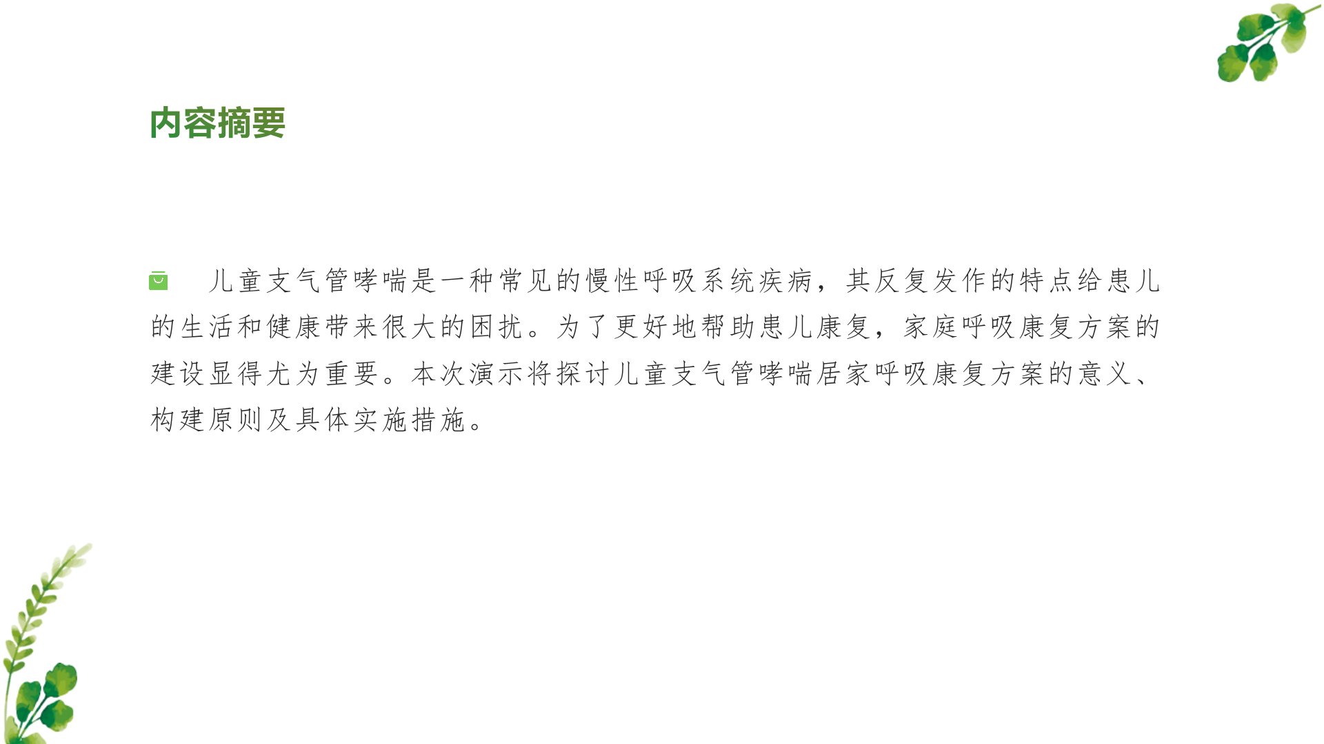 儿童支气管哮喘居家呼吸康复方案的构建摘要儿童支气管哮喘是常见慢性呼吸系统疾病反复发作影响患儿健康与生活居家呼吸康复方案的建设尤为关键。其意义在于可助患儿日常有效呼吸训练改善肺功能增强体质减少哮喘发作缓解症状提高生活质量提供持续治疗关怀增强信心决心促进身心发展。构建方案需遵循个体化原则依患儿病情、年龄等差异制定;循序渐进原则逐步增加训练强度;长期坚持原则长期锻炼调整才有效;监控与评估原则定期检查评估调整计划。实施措施包括制定详细训练计划进行呼吸肌训练增加运动量合理饮食控制环境开展健康教育给予心理支持定期随访。未来需进一步开展大规模、长期临床研究依个体情况制定个性化治疗方案。