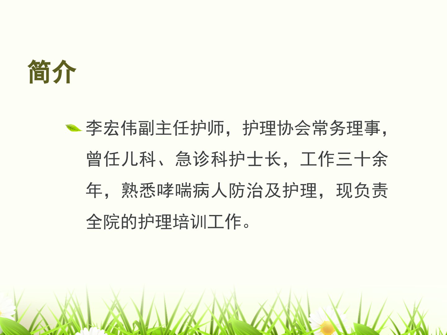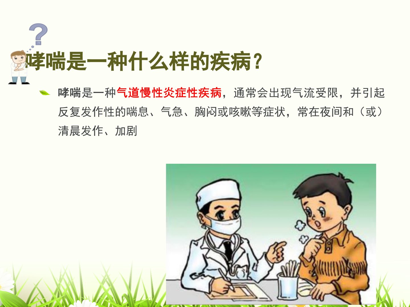 李宏伟副主任护师介绍了哮喘儿童日常护理。哮喘是气道慢性炎症性疾病常表现为气流受限和反复发作的喘息等症状。儿童哮喘的诱发因素有遗传、病毒感染、过敏原、运动和环境因素等其中病毒是最常见诱发因素运动影响约九成患儿过敏性哮喘占比达4050找出过敏原并避免接触至关重要。对于已确诊的哮喘患儿家长需协助孩子坚持日常监测并定期随访规范治疗不可随意停药或换药。同时家长要避免陷入误区:一是哮喘不会随年龄增长不治自愈未及时治疗会影响肺功能;二是用药后没症状不代表哮喘治好气道炎症可能仍存在;三是不可自行停药否则会加重病情;四是吸入性糖皮质激素安全性高长期使用不影响孩子生长发育;五是症状控制后仍需定期去医院随访便于医生及时调整治疗方案。