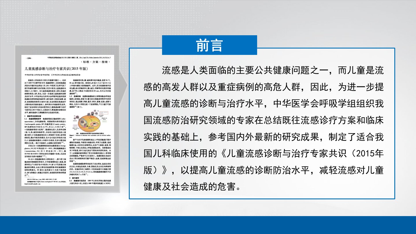 《儿童流感诊断与治疗专家共识(2015年版)》解读摘要流感是主要公共健康问题儿童是流感高发及重症高危人群。为提高儿童流感诊治水平中华医学会呼吸学组组织专家在总结既往诊疗方案与临床实践并参考国内外最新研究成果后制定了《儿童流感诊断与治疗专家共识(2015年版)》。流感病毒会感染呼吸道粘膜上皮细胞引发一系列症状病毒及代谢物入血还会造成病毒血症及全身症状。一般健康儿童感染多为轻型婴幼儿症状不典型重症患儿病情发展迅速首要死亡原因是呼吸系统并发症合并细菌感染会增加死亡率。儿童流感易发生多种并发症肺炎是常见并发症还可合并肝脏、肾脏损害出现神经系统受累、心肌炎等情况。治疗方面抗流感病毒药物有M2离子通道阻滞剂(因高耐药率及不良反应不建议单独用于甲型流感治疗预防)和神经氨酸酶抑制剂。治疗原则是在发病48h内尽早开始抗流感病毒药物治疗合理使用对症治疗药物避免盲目或不恰当使用抗生素。预防手段上疫苗是预防流感的第一道防线6月龄以上儿童按推荐程序接种可产生保护作用但6月龄以下、对鸡蛋或疫苗成分过敏、患轻中度急性疾病者等有接种禁忌。抗流感病毒药物是疫苗重要辅助手段。