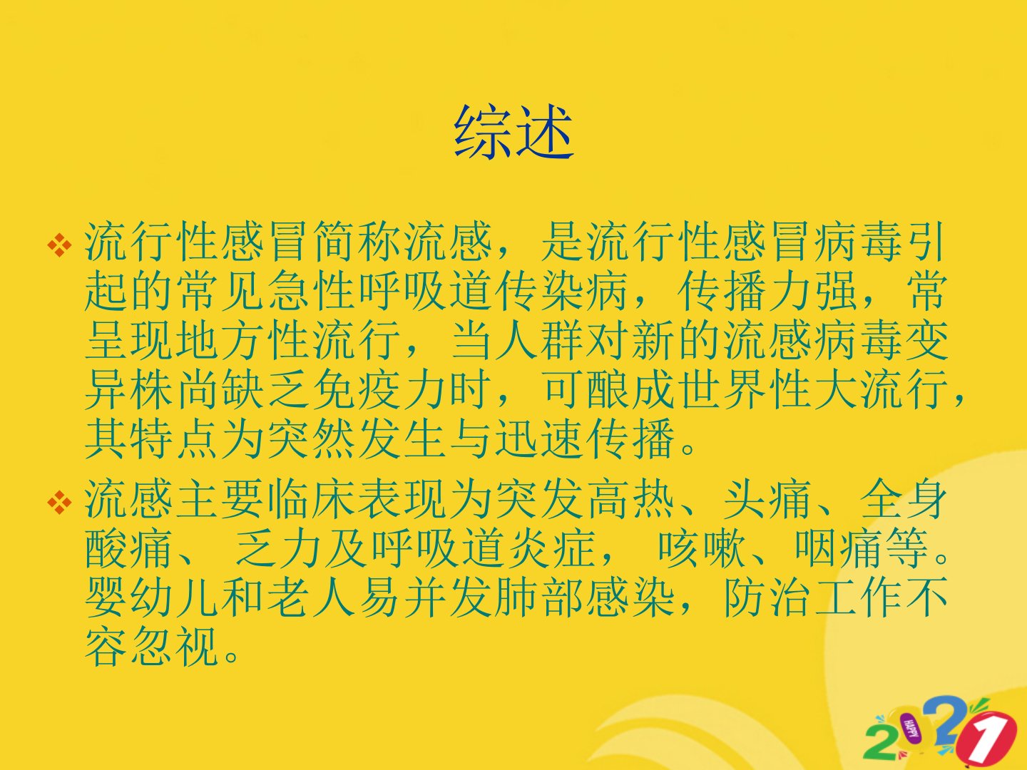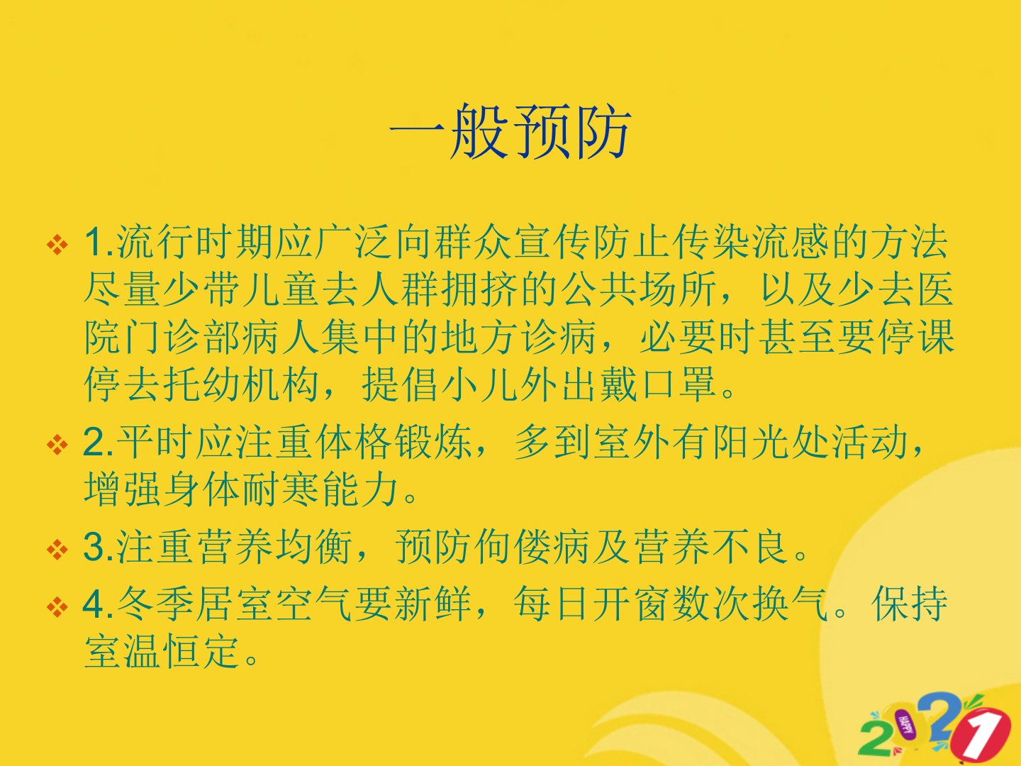 儿童流感的预防与护理综述流行性感冒由流感病毒引发是急性呼吸道传染病传播力强常呈地方性流行新病毒变异株出现时或致世界性大流行。其症状包括突发高热、头痛、全身酸痛等婴幼儿和老人易并发肺部感染。预防上流行期要宣传防传染方法少带儿童去人群密集处必要时停课、停托幼机构外出戴口罩;平时注重体格锻炼均衡营养预防佝偻病与营养不良;冬季保持居室空气新鲜、室温恒定。疫苗接种方面流感疫苗对部分类型流感有强预防作用912月接种三岁以下儿童需接种两次间隔一月。护理上饮食宜清淡少油腻以易消化流质、半流质食物为主少量多餐保证水分、维生素摄入供给高蛋白等饮食。家庭护理要注意早发现、隔离、治疗病人保持空气新鲜做好病人保温、休息、消毒工作可借助药饮食疗降温高烧不退及时就医。