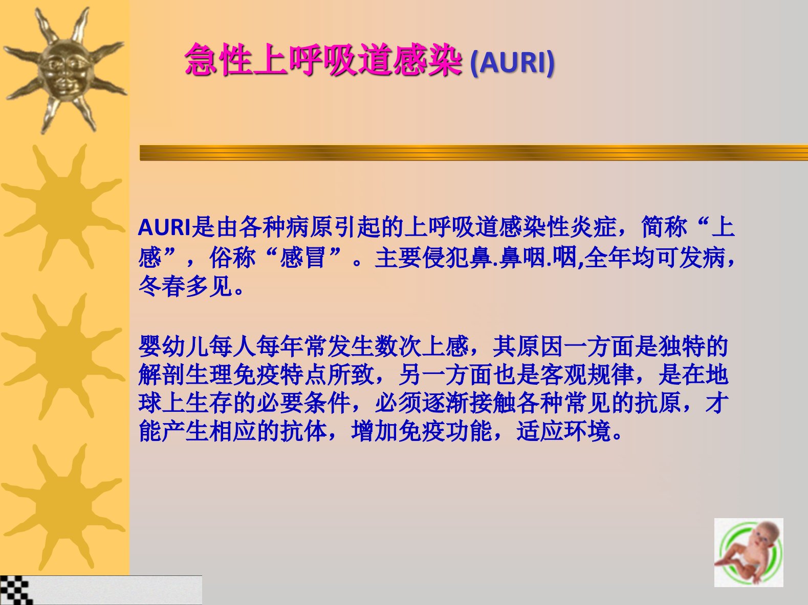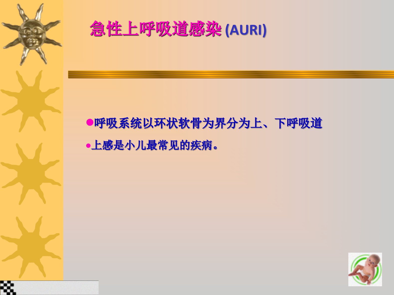 儿童呼吸系统疾病肺炎急性上呼吸道感染(AURI)AURI是由各种病原引起的上呼吸道感染性炎症,简称“上感”,俗称“感冒”。主要侵犯鼻.鼻咽.咽,全年均可发病,冬春多见。婴幼儿每人每年常发生数次上感,其原因一方面是独特的解剖生理免疫特点所致,另一方面也是客观规律,是在地球上生存的必要条件,必须逐渐接触各种常见的抗原,才能产生相应的抗体,增加免疫功能,适应环境。急性上呼吸道感染(AURI)呼吸系统以环状软骨为界分为上、下呼吸道上感是小儿最常见的疾病。病毒所致AURI者占90%以上主要病原为:合胞病毒、流感病毒、副流感病毒、巨细胞病毒、鼻病毒、腺病毒、柯萨奇病毒亦可继发细菌感染病原学临床表现依病...