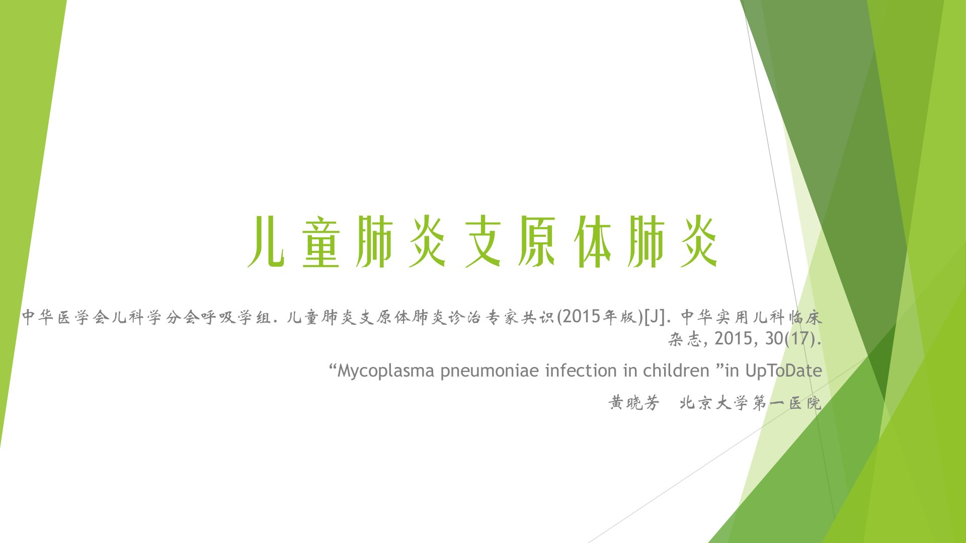 儿童肺炎支原体肺炎中华医学会儿科学分会呼吸学组.儿童肺炎支原体肺炎诊治专家共识(2015年版)[J].中华实用儿科临床杂志,2015,30(17).“Mycoplasmapneumoniaeinfectioninchildren”inUpToDate黄晓芳北京大学第一医院背景肺炎支原体(Mycoplasmapneumoniae,MP)是儿童社区获得性肺炎(Community—acquiredpneumonia,CAP)的重要病原之一,肺炎支原体肺炎(Mycoplasmapneumoniaepneumonia,MPP)占住院儿童CAP的10%一40%。病原及发病机制MP属于柔膜体纲,支原体属,革...