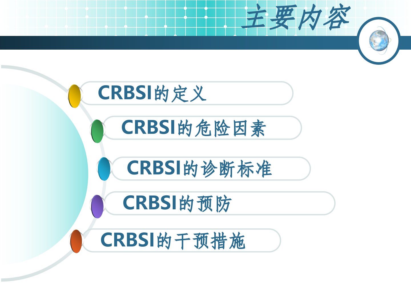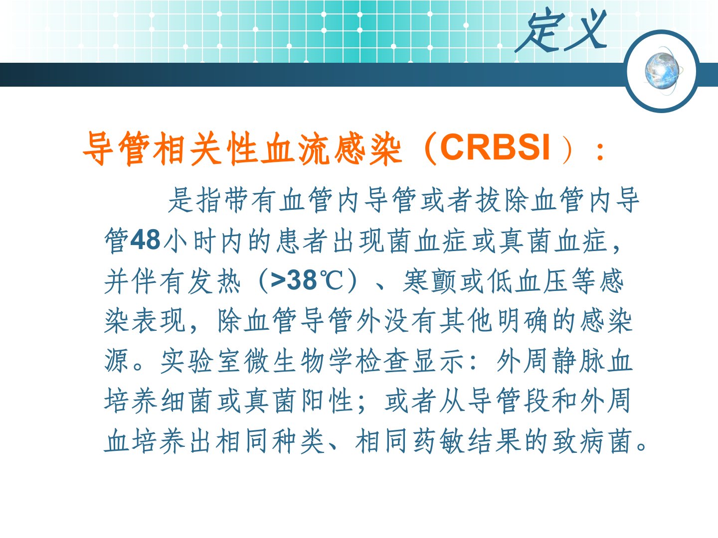 导管相关性血流感染Clicktoaddyourtext临床实践标准主要内容CRBSI的干预措施CRBSI的预防CRBSI的危险因素CRBSI的定义CRBSI的诊断标准定义导管相关性血流感染(CRBSI):是指带有血管内导管或者拔除血管内导管48小时内的患者出现菌血症或真菌血症,并伴有发热(>38℃)、寒颤或低血压等感染表现,除血管导管外没有其他明确的感染源。实验室微生物学检查显示:外周静脉血培养细菌或真菌阳性;或者从导管段和外周血培养出相同种类、相同药敏结果的致病菌。导管的血流感染率计算方法:每1000个中心静脉导管日的导管相关性感染数CRBSI=*1000感染例数中心静脉导管留置日流行病学2...
