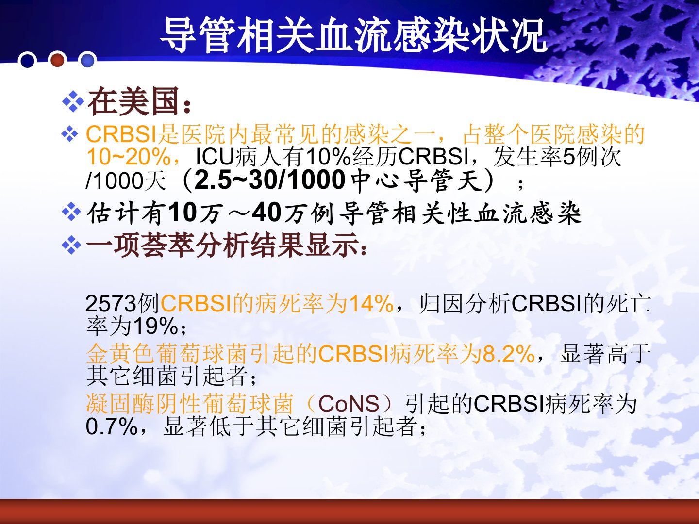 摘要导管相关血流感染(CRBSI)是美国医院内最常见的感染之一占医院感染的1020病死率为14归因死亡率为19金黄色葡萄球菌引起的CRBSI病死率高达82。CRBSI后果严重增加住院天数、死亡率和治疗费用。CRBSI危险因素包括中心静脉导管留置时间过长、医院内细菌定植、导管相关的医疗操作频率高、插管技术及置管后的护理不当、患者疾病严重程度及基础疾病、输液系统及穿刺部位污染、静脉导管的材质、接受静脉高营养治疗的患者、单腔与双腔导管差异等。CRBSI的发病机制包括穿刺部位的皮肤细菌移行、导管接口部污染、经血行污染导管端口、输液污染、导管材料感染菌内在特性等。CRBSI的病原学常见病原微生物包括凝固酶阴性葡萄球菌、革兰阴性厌氧杆菌、白色念珠菌。CRBSI诊断与培养目前尚无金标准配对血培养阳性时间差是简单诊断方法同时介绍了多种导管相关感染的定义、血培养的正确观念及采集方法、导管相关血流感染的培养方法与结果解释。CRBSI的预防包括手卫生、大手术铺巾、洗必泰皮肤消毒、选择锁骨下静脉部位、每天评估插管必要性、选择适当的导管和插管部位、严格的无菌操作插管、护理、教育培训、改善CVC操作环境、注意输液