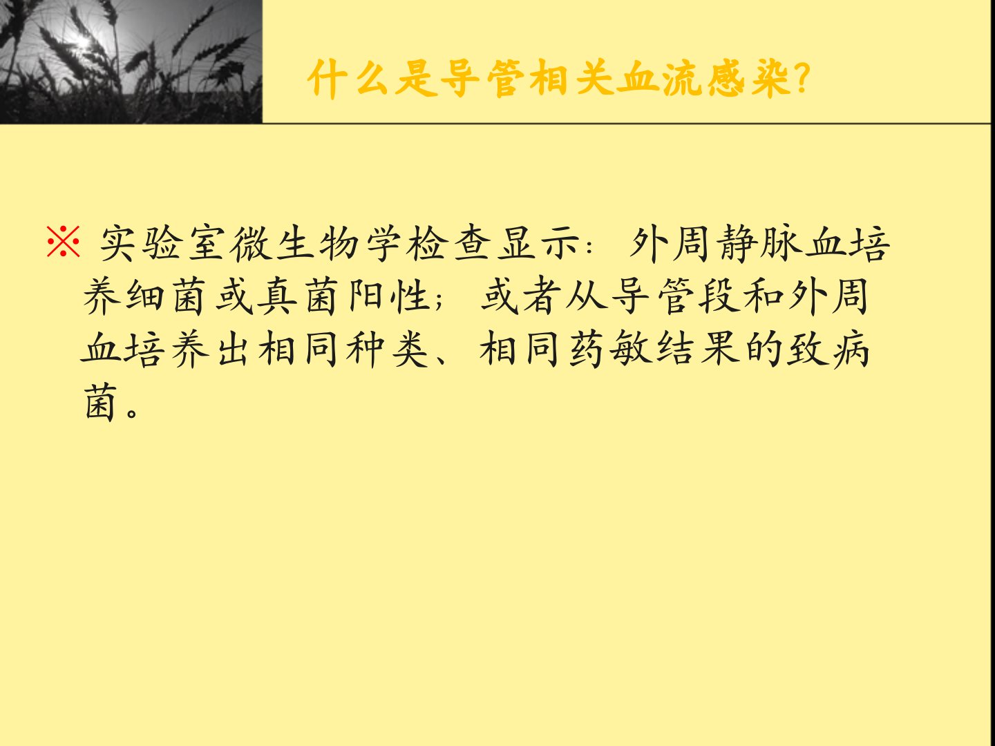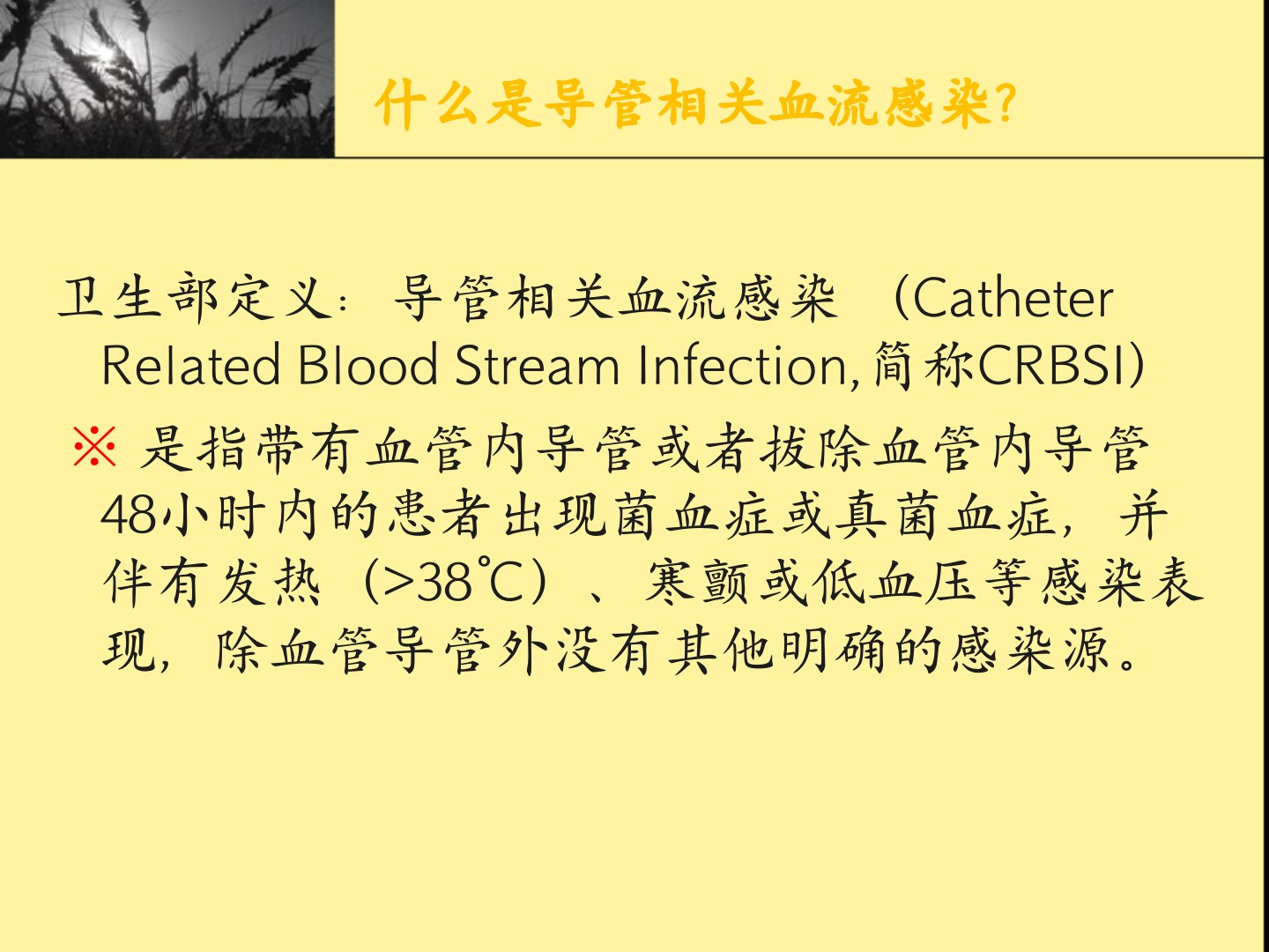 导管相关血流感染(CRBSI)指带有血管内导管或拔除导管48小时内患者出现菌血症或真菌血症伴有发热等感染表现且无其他明确感染源。实验室微生物学检查显示外周静脉血培养细菌或真菌阳性或从导管段和外周血培养出相同种类、相同药敏结果的致病菌。其危险因素包括长期住院、免疫功能差、静脉高营养治疗、导管留置时间长、输液连接口菌落数高、穿刺部位污染、抗菌药物长期使用、无菌操作不严格、导管相关医疗操作频率高、穿刺技术不熟练、导管材质差等。诊断标准包括导管培养与外周静脉血培养阳性且为同一微生物等。预防措施包括选择合适的穿刺部位、严格洗手和无菌操作、做好血管导管穿刺部位的护理和敷料更换、对附加装置进行消毒和更换、成立专业的输液小组并进行相关教育和培训、做好品质监控等。同时循证医学不推荐一些常规预防措施如对常规拔除的导管尖端进行细菌培养等。