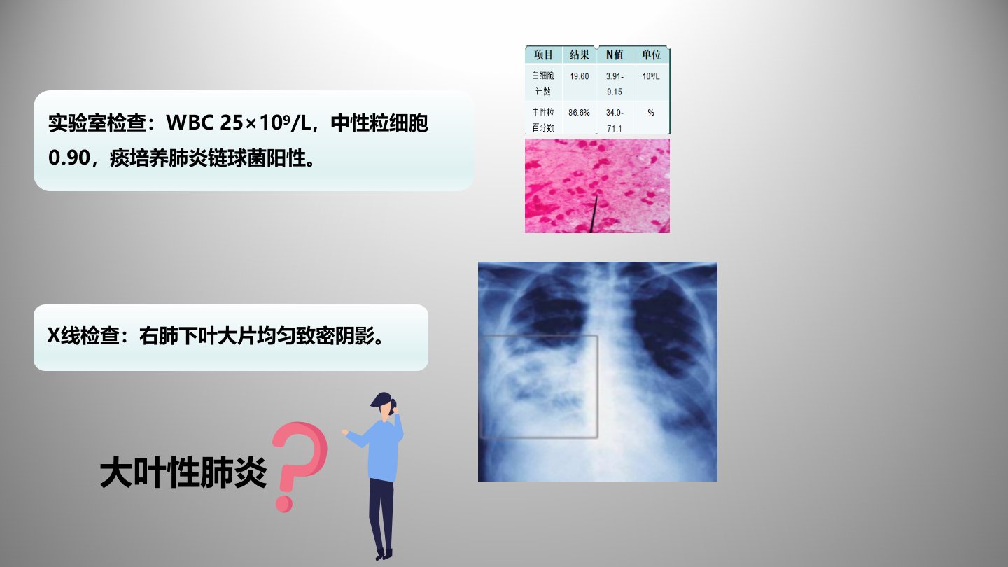 呼吸系统疾病实验室检查显示患者WBC升高中性粒细胞比例高痰培养肺炎链球菌阳性X线检查右肺下叶有大片均匀致密阴影提示大叶性肺炎。大叶性肺炎90以上由肺炎链球菌感染引起多见于青壮年受寒、疲劳、醉酒、麻醉等是常见诱因。病变累及一个肺段或一个大叶其病理变化分为充血水肿期和红色肝样变期等阶段。充血水肿期肺体积增大、重量增加、呈暗红色X线见片状模糊阴影;红色肝样变期肺实变体征明显X线大片均匀致密阴影患者会有高热、呼吸急促、寒战、咳铁锈色痰等表现。思考题提出若小战士的病未及时治疗病情将如何变化这些病理变化又会导致怎样的临床表现。