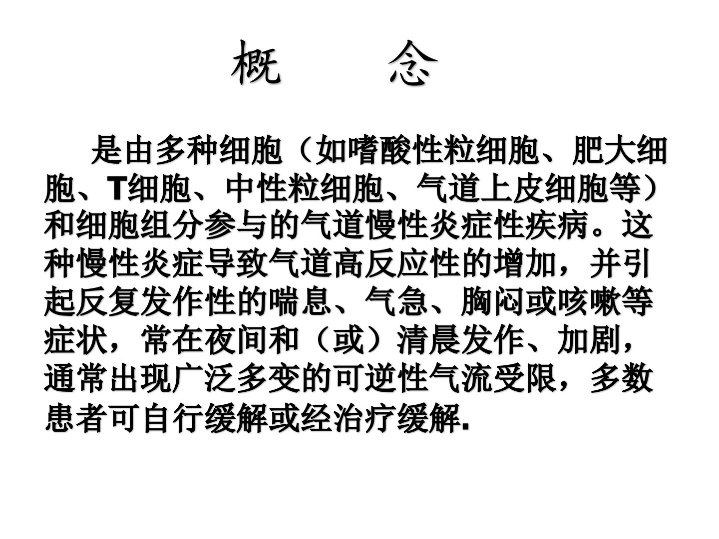 成人哮喘是多种细胞和细胞组分参与的气道慢性炎症性疾病表现为气道高反应性、反复发作性喘息等症状常有家族倾向。哮喘发病机制与神经受体失衡有关诊断标准包括反复发作症状、双肺哮鸣音等。治疗原则是达到并维持临床控制包括无症状、无夜间症状、肺功能正常等。主要药物包括支气管舒张药(如2受体激动剂、茶碱类、抗胆碱能药物)和抗炎药物(如糖皮质激素、色苷酸钠、白三烯调节剂、抗组胺药)。支气管舒张药可缓解气道阻塞症状抗炎药物可抑制及预防气道炎症发展。抗炎药物使用需早期、长期用药联合用药(如ICSLABA)适用于中重度持续哮喘。哮喘管理目标是控制症状、维持正常活动、预防急性加重和死亡等。