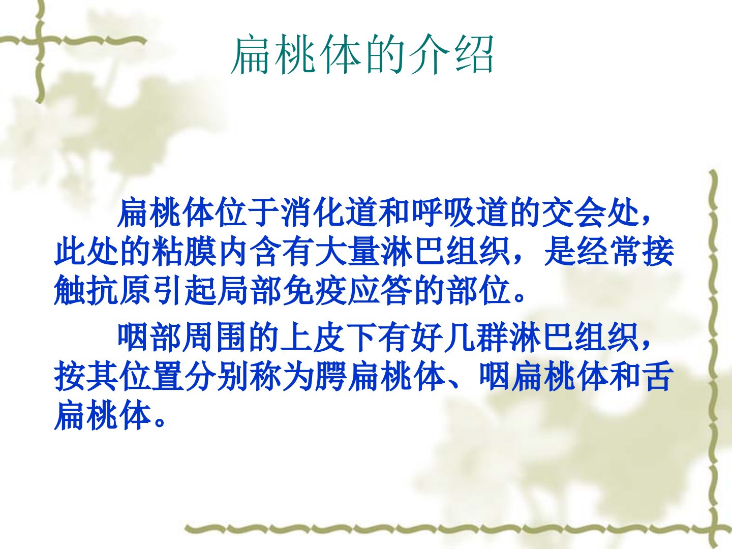 扁桃体位于消化道和呼吸道交会处含大量淋巴组织分为腭扁桃体、咽扁桃体和舌扁桃体。扁桃体能抵抗细菌对人体起保护作用但小儿抵抗力低易受细菌侵入引发炎症。急性扁桃体炎为腭扁桃体急性非特异性炎症伴有轻重不等的急性咽炎中医称“喉蛾胀”或“蛾风”分为急性卡他性和急性化脓性两种。慢性扁桃体炎是常见疾病儿童多表现为腭扁桃体增生肥大成人多表现为炎性改变。预防扁桃体炎体弱多病的宝宝应加强锻炼慢性扁桃体肥大的宝宝应早晚用淡盐水漱口。同时要爱护口腔卫生养成良好的生活习惯。急性扁桃体炎有传染性应适当隔离可用抗菌素及磺胺类药物高热头痛及全身酸痛者可选用解热镇痛剂。慢性扁桃体炎反复发作或形成病灶感染可行扁桃体切除术也可通过一般治疗、选用合适药物、外治及小儿推拿控制发作。