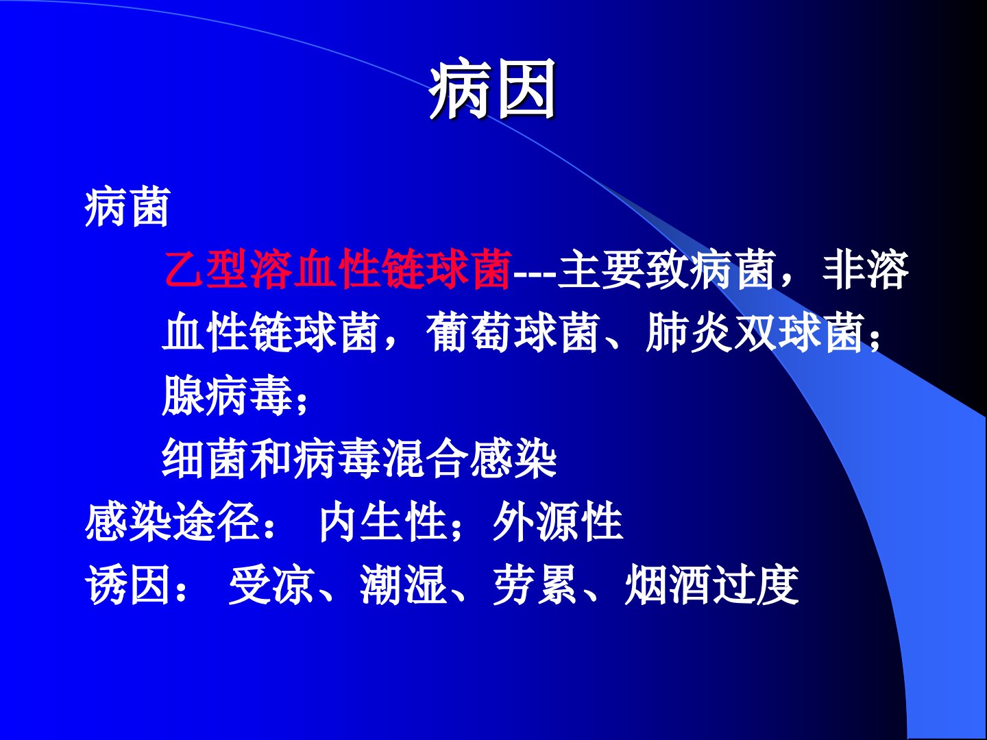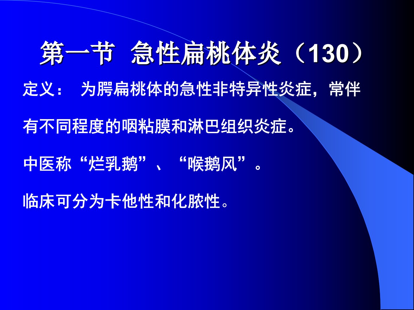 扁桃体炎及咽部脓肿摘要扁桃体炎急性扁桃体炎定义:腭扁桃体的急性非特异性炎症常伴咽粘膜和淋巴组织炎症。临床分类:卡他性、化脓性。病因:乙型溶血性链球菌等病菌、腺病毒等感染。病理:分急性卡他性、滤泡性、隐窝性、化脓性四型。症状:咽痛、吞咽困难、高热等可引起耳痛。诊断:据临床表现诊断需与咽白喉等鉴别。治疗:一般疗法、抗生素、局部治疗、中医中药频繁发作者或有并发症者可手术。慢性扁桃体炎病因:急性扁桃体炎反复发作或隐窝引流不畅。病理:增生型、纤维性、隐窝型。临床表现:反复发作史平时症状少儿童有呼吸等障碍。诊断:据发作史、扁桃体充血等诊断需与扁桃体生理性肥大等鉴别。治疗:非手术疗法增强免疫手术疗法如扁桃体剥离术有适应证和禁忌症。咽部脓肿扁桃体周围脓肿定义:发生于扁桃体周围隙内的化脓性炎症。病因:常继发于急性扁桃体炎。治疗:脓肿形成前用抗生素等形成后穿刺抽脓等。咽后脓肿定义:咽后隙的化脓性炎症分急慢性。治疗:急性型口内切开排脓等慢性型口内穿刺等。咽旁脓肿定义:咽旁间隙的化脓性炎症。治疗:脓肿形成前用抗生素等形成后切开排脓。
