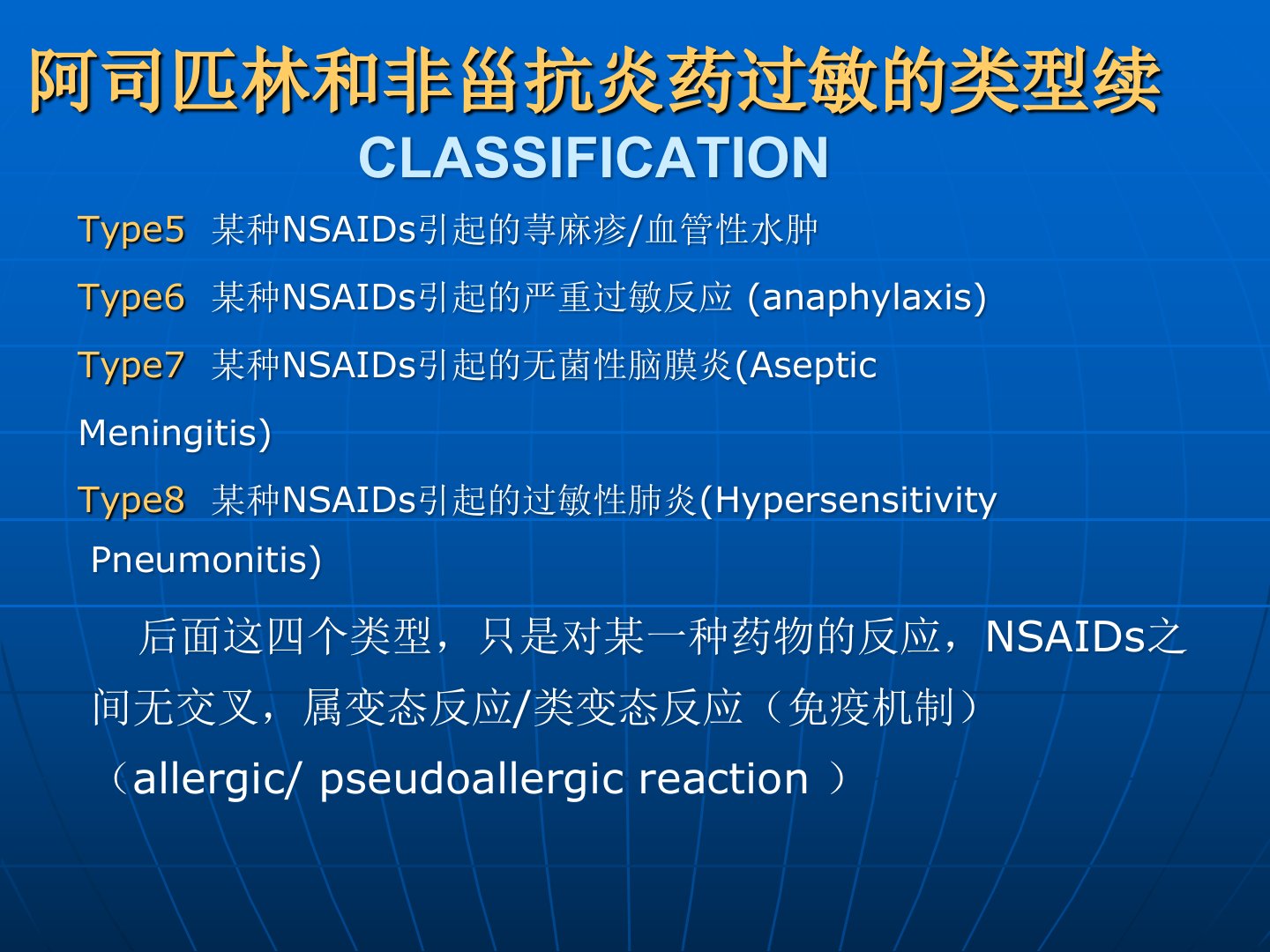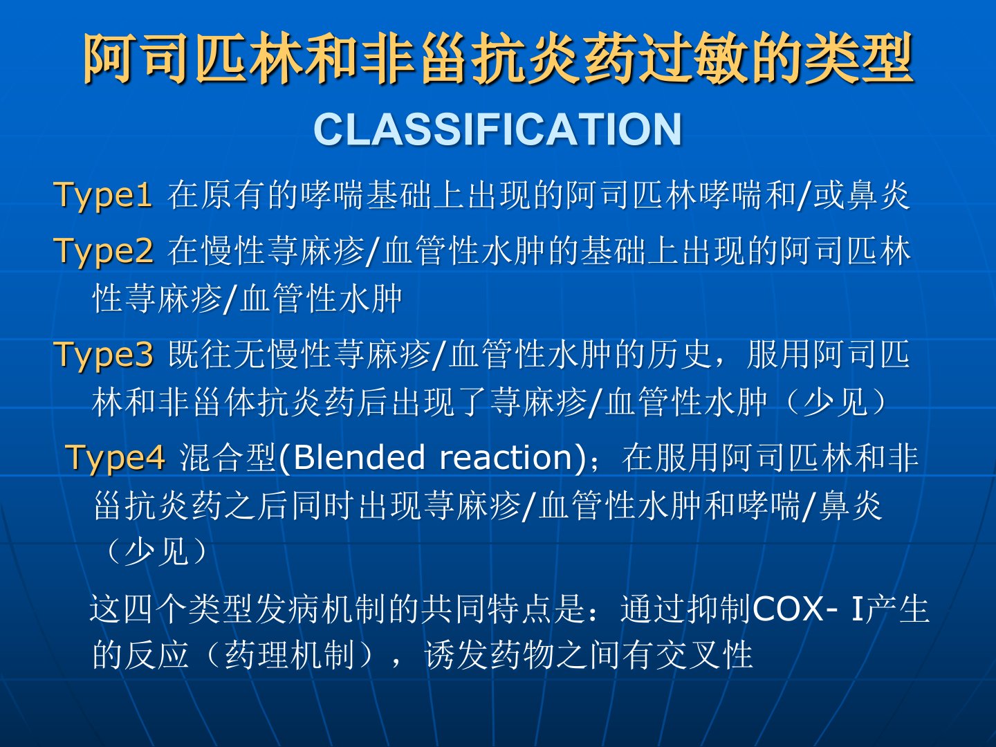阿司匹林和非甾体抗炎药的过敏反应摘要阿司匹林和非甾体抗炎药过敏类型多样可分为八大类前四类通过抑制COXI产生反应药物间有交叉性后四类是对某一种NSAIDs的反应属变态反应类。阿司匹林性哮喘指部分支气管哮喘患者服用相关药物后诱发剧烈哮喘发作不同化学结构的NSAIDs可有交叉反应。当伴有鼻息肉和鼻窦炎时称为阿司匹林三联征。其发病率依诊断方法而异罹患鼻息肉鼻窦炎的哮喘患者阳性率较高且女性多见儿童少见。引发阿司匹林哮喘的药物包括阿司匹林、解热镇痛药、非甾体抗炎药及其复方制剂。阿司匹林哮喘可分为哮喘基础型、鼻炎基础型、启动型三型。典型表现为服药后5分钟至2小时引起剧烈哮喘。诊断可用积分法或激发试验。治疗方面药物作用相与重症哮喘急性发作相同非药物作用相则用皮质激素吸入等。预防需避免服用相关药物及含特定色素的食品。