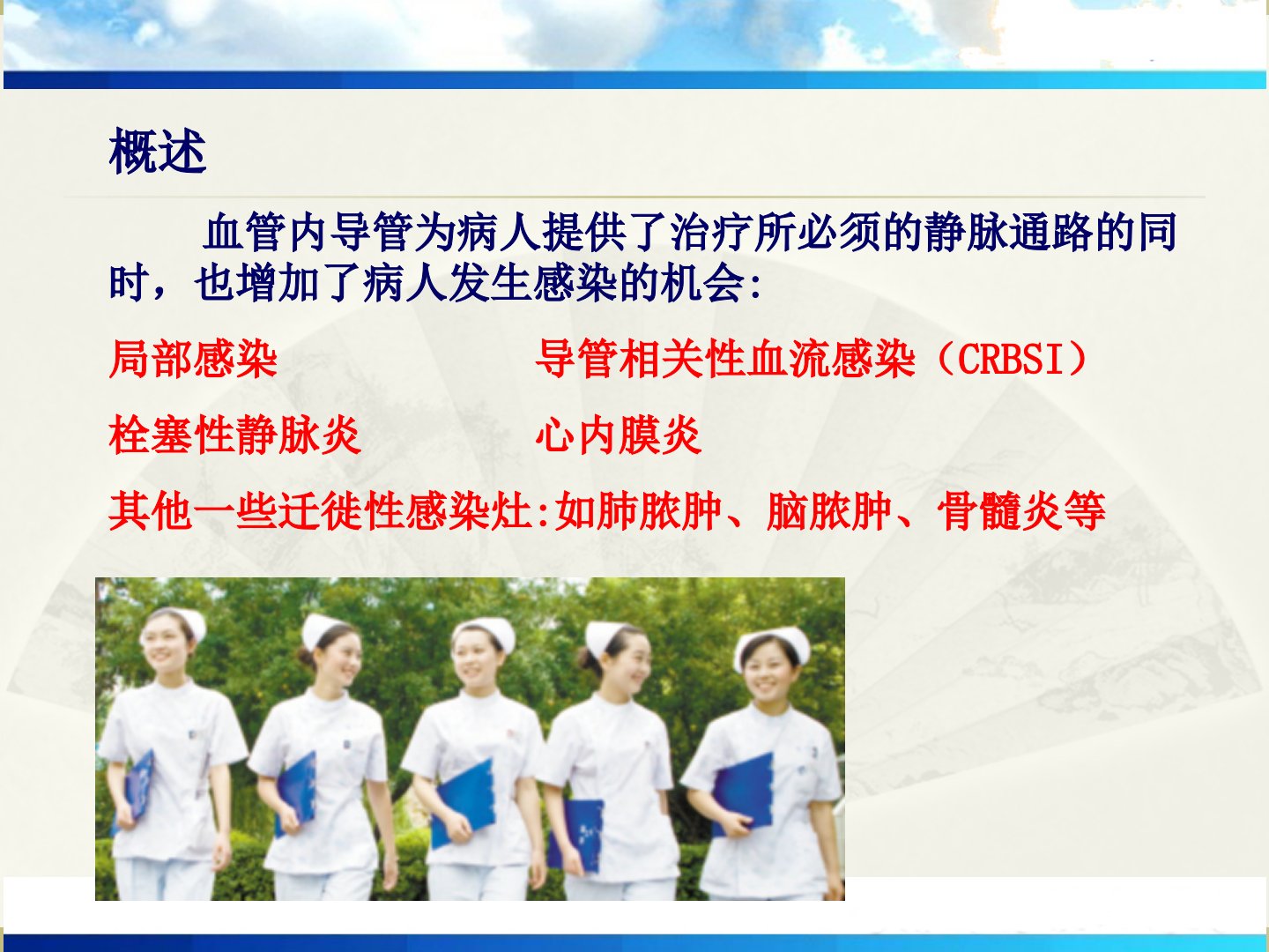 血管内导管为病人提供静脉通路的同时也增加了感染风险我国年医疗输液量庞大导管相关感染后果严重会显著增加医疗费用、住院时间与患者病死率。PICC导管相关感染包括局部感染、全身感染等原发性CRBSI指病原菌经穿刺点或导管接头侵入血流继发性CRBSI指病原菌从其他感染灶入血后粘附在导管头。感染诊断方法包括临床症状、实验室检查等确诊需满足一定条件。感染原因包括导管留置时间、脂肪乳剂应用、置管部位、机体免疫力、护士操作、导管材质及型号等。预防和管理方面要建立置管技术资格准入制度成立静脉治疗小组定期开展培训实行集束干预策略包括手部卫生、最大无菌屏障、皮肤消毒、选理想置管位置、每日评估导管留置必要性等还要合理选择导管材料、型号、敷料正确固定导管、冲管封管做好患者教育。