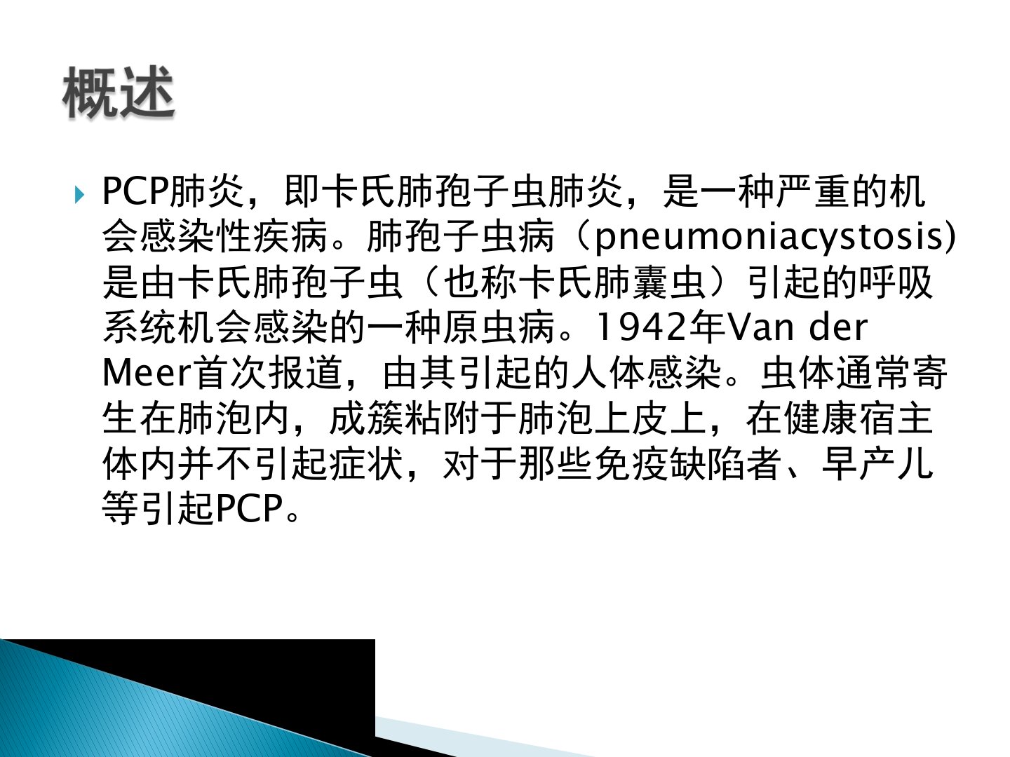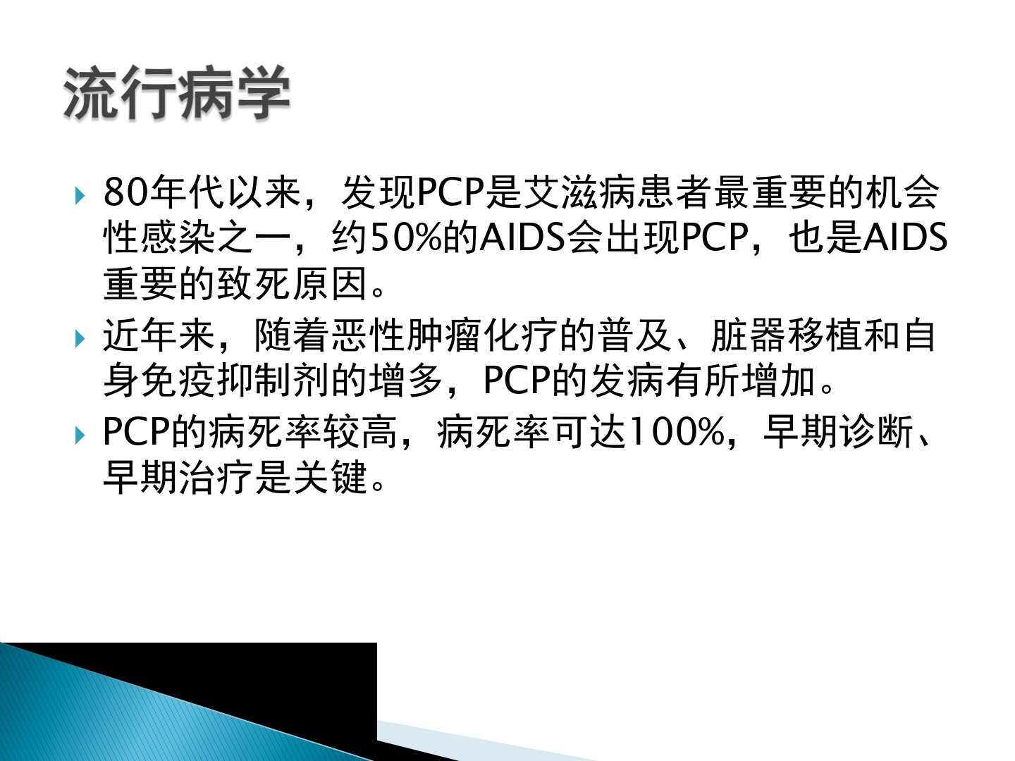 PCP肺炎即卡氏肺孢子虫肺炎是一种严重机会感染性疾病由卡氏肺孢子虫引起。1942年首次报道人体感染病例虫体通常寄生在肺泡内对健康宿主不引起症状但可引发免疫缺陷者、早产儿等患病。80年代以来PCP成为艾滋病患者最重要的机会性感染之一也是其重要致死原因。近年来随着恶性肿瘤化疗普及、脏器移植和自身免疫抑制剂使用增多PCP发病有所增加其病死率较高早期诊断、早期治疗是关键。PCP临床分为流行性和散发型两种类型前者多见于婴幼儿后者多见于有免疫缺陷者尤其是AIDS患者。实验室检查中病原学检查病原体阳性率极低X线表现非特异性。确诊依靠病原学及痰液或BALF和肺组织活检发现卡氏肺孢子虫。治疗方面一般治疗包括加强支持治疗、恢复免疫功能等;复方磺胺甲恶唑是首选药物;喷他眯、克林霉素—伯氨喹、三甲曲沙等也可用于治疗。