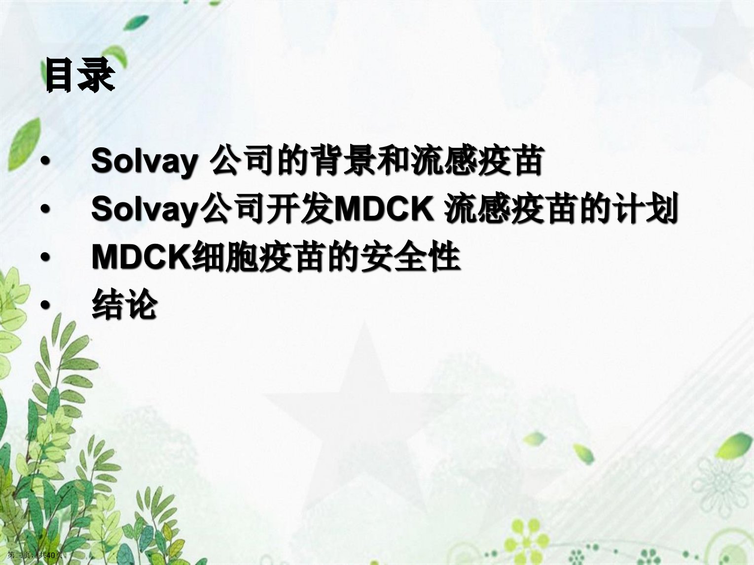 MDCK细胞流感疫苗安全性文档摘要Solvay药业为SolvayGroup旗下大药厂在全球多地设有研发中心。作为欧洲首家生产流感疫苗的厂家55年来生产未间断总产量达25亿剂供应超50个国家。传统鸡胚疫苗采用开放性生产系统易污染且鸡胚供应受禽病影响Solvay公司因此开发MDCK细胞流感疫苗。MDCK细胞对流感病毒敏感谱广病毒产量、纯度高经济合算。Solvay公司已有10年以上MDCK细胞流感疫苗研发经验已进行临床前和临床开发获荷兰商业性生产许可将获全球包括美国的许可。MDCK细胞安全性经过严格评估包括细胞系特征、传代历史、可能的外来因子及致癌性等。结果显示未发现外源性微生物感染致癌性在免疫功能正常动物中未观察到。下游生产过程通过微载体无血清培养及特定处理消除了完整细胞和细胞DNA保证疫苗安全性。临床前和临床研究显示MDCK细胞疫苗安全性与鸡胚疫苗相当且副反应较小。因此MDCK细胞是生产流感灭活疫苗的安全细胞。