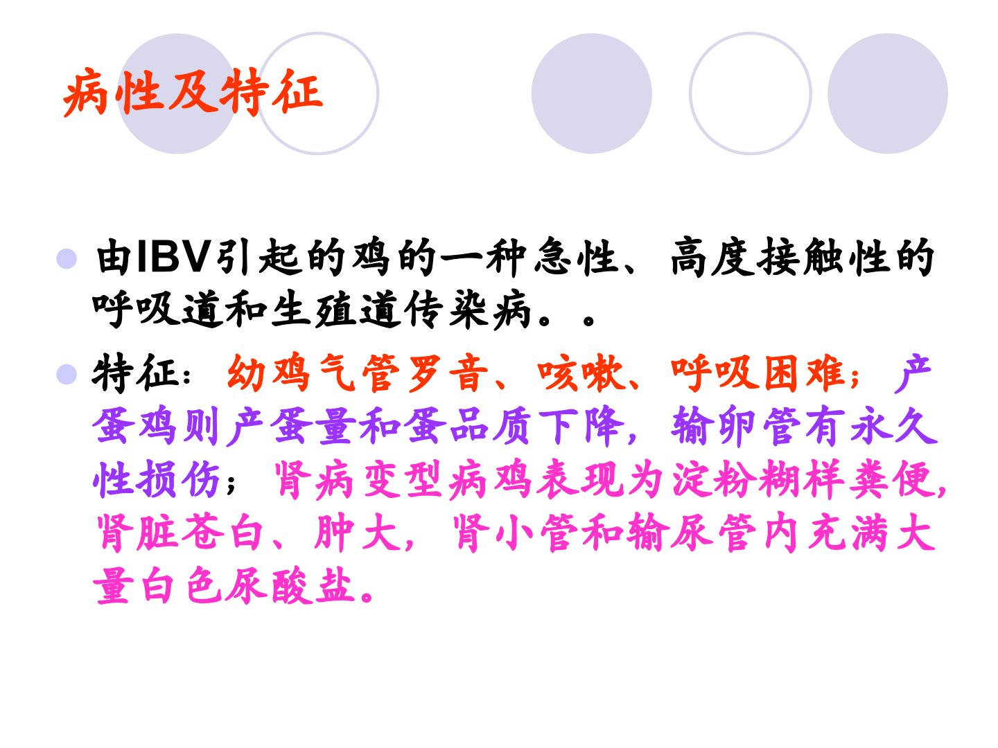 传染性支气管炎(IB)由IBV引起是鸡的急性、高度接触性呼吸道和生殖道传染病。幼鸡表现为气管罗音、咳嗽;产蛋鸡产蛋量和蛋品质下降输卵管有永久性损伤;肾病变型病鸡则排淀粉糊样粪便肾脏肿大。IBV属于冠状病毒科主要结构蛋白包括纤突(S)蛋白等其中S蛋白与免疫原性有关。基因组易突变导致新血清型出现现已发现超过30种血清型。IBV感染鸡胚后鸡胚会呈现矮小、蜷缩等特征。流行病学显示各日龄鸡均易感传播迅速。临床症状复杂包括呼吸型、肾型、腺胃型。诊断依据呼吸道症状和病变结合流行病学确诊需实验室检查。防制以预防接种为主疫苗包括H120和H52弱毒苗等。鸡传染性喉气管炎(ILT)由ILTV引起是急性接触性呼吸道传染病临床特征是呼吸困难、咳血样分泌物喉头和气管粘膜出血坏死。ILTV属疱疹病毒科只有一个血清型。防制同样以免疫接种为主加强饲养管理定期消毒。