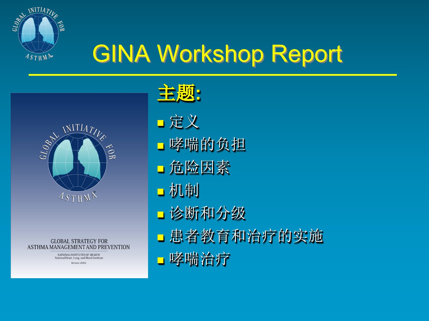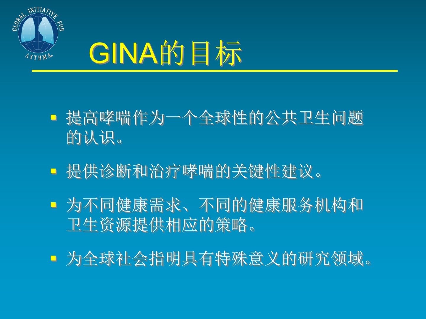 GINA(全球哮喘防治创议)旨在提升哮喘的公共卫生认知提供关键性诊疗建议并针对不同健康需求和服务机构制定策略。哮喘定义为慢性气道炎症性疾病症状包括喘息、气紧等与气流阻塞有关。哮喘负担重是常见慢性病发病率逐年上升影响学习工作增加死亡风险医疗支出高昂。哮喘的危险因素包括宿主因素(遗传素质、特应性、气道高反应性等)和环境因素(变应原、空气污染、呼吸道感染等)。GINA强调哮喘诊断需综合病史、症状、体格检查和肺功能检查等。治疗管理包括六部分:教育患者、评估疾病严重程度、避免危险因素、制定长期治疗计划、控制急性加重、提供定期随访。推荐阶梯治疗以最少药物达到治疗目标并考虑文化差异和医疗体系。哮喘虽不能治愈但大多能有效控制。