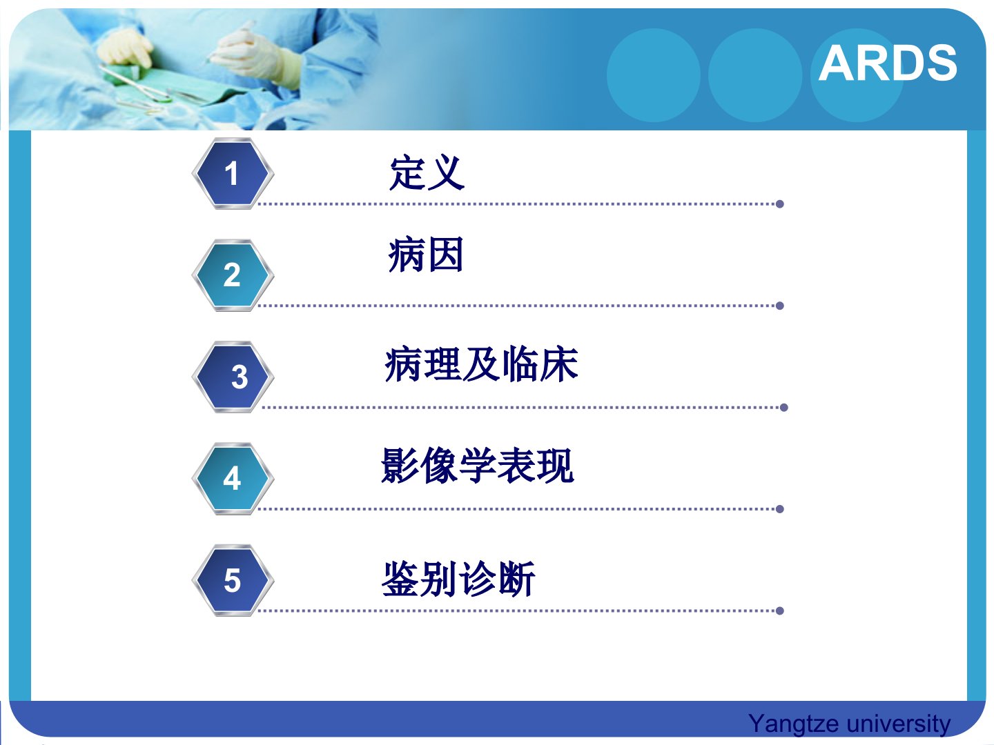 ARDS(急性呼吸窘迫综合征)摘要ARDS即急性呼吸窘迫综合征是由多种原发疾病致肺毛细血管损伤后毛细血管通透性增加引发的非心源性肺水肿属严重临床综合征常表现为急性进行性缺氧性呼吸衰竭通常由急性肺损伤(ALI)发展而来可进一步导致多器官功能障碍综合症(MODS)是MODS最早出现的器官损害。其病理特征为肺广泛充血水肿、肺泡内透明膜形成等。临床表现上症状包括起病急剧隐匿、呼吸频率加快、缺氧表现、发热伴烦躁等;体征有呼吸急促困难、湿啰音、紫绀;实验室检查关注PaO2;影像学表现分早中晚期各有不同特征。鉴别诊断方面与心源性肺水肿相比心腔扩大、肺叶血管扩张呈“蝶翼征”等为不同点;与肾源性肺水肿相比肺纹理普遍增粗等是差异。文中还提及一69岁男性患者病案有糖尿病等病史放置鼻胃管后出现呼吸窘迫。