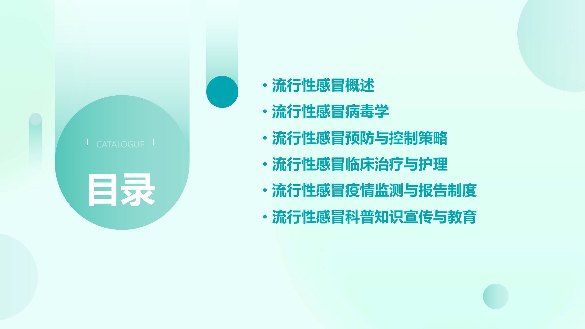 流行性感冒医学课件摘要本课件围绕流行性感冒(流感)展开首先概述了流感是由流感病毒引起的急性呼吸道传染病具有高度传染性和快速传播速度。流感病毒易变异人群普遍易感且病后免疫力不持久。流感患者和隐性感染者是传染源主要通过空气传播人群普遍易感但老年人、儿童等更易感染具有季节性和周期性。临床表现包括高热、头痛等症状可分为单纯型、胃肠型、肺炎型和中毒型。诊断需结合流行病学史、临床表现及实验室检查同时需与普通感冒等疾病鉴别。病毒学部分介绍了病毒形态、组成、特性及复制过程。预防与控制策略包括疫苗接种政策、抗病毒药物使用、隔离治疗、监测预警等。临床治疗与护理需根据患者特点制定方案关注发热、呼吸道等症状护理并预防并发症。疫情监测与报告制度涉及监测点设置、指标、数据收集与分析。最后课件强调了科普知识宣传与教育的重要性介绍了宣传内容和形式并通过问卷调查、知识测试等方式评估宣传效果。