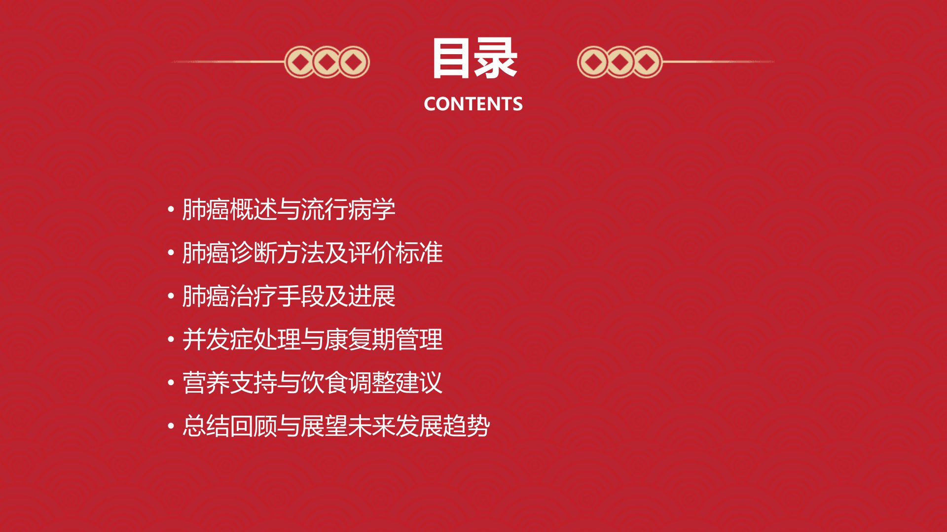 《肺癌基础知识科普》PPT摘要一、肺癌概述与流行病学肺癌源于肺部支气管黏膜或腺体分小细胞与非小细胞肺癌两类。吸烟是主要危险因素约85的肺癌与之有关职业暴露、空气污染、遗传因素也会增加风险。肺癌是全球常见恶性肿瘤我国发病率和死亡率上升且男性高于女性。预防需控烟、改善空气质量、加强职业防护和定期体检。二、肺癌诊断方法及评价标准肺癌症状包括咳嗽、胸痛、呼吸困难等。诊断方法有X线、CT、MRI、PETCT检查及肿瘤标志物检测等。需结合临床表现、影像学和实验室检查综合判断疑似患者应进行组织病理学检查以明确诊断同时与肺结核等疾病鉴别。三、肺癌治疗手段及进展治疗包括手术、放疗、免疫治疗等。手术需评估适应症与禁忌症选择合适术式并做好术前准备与术后护理。放疗应用先进技术提高精度免疫治疗通过激活免疫系统攻击肿瘤细胞。四、并发症处理与康复期管理处理呼吸道、心血管等并发症保证患者良好作息、合理饮食、适量运动进行心理干预定期随访并制定复查计划。五、营养支持与饮食调整建议评估患者营养状况制定个性化营养补充计划选择合适营养补充途径。建议患者均衡膳食、多样化选择食物、合理安排餐次避免刺激性食物澄清饮食误区并提供实用小