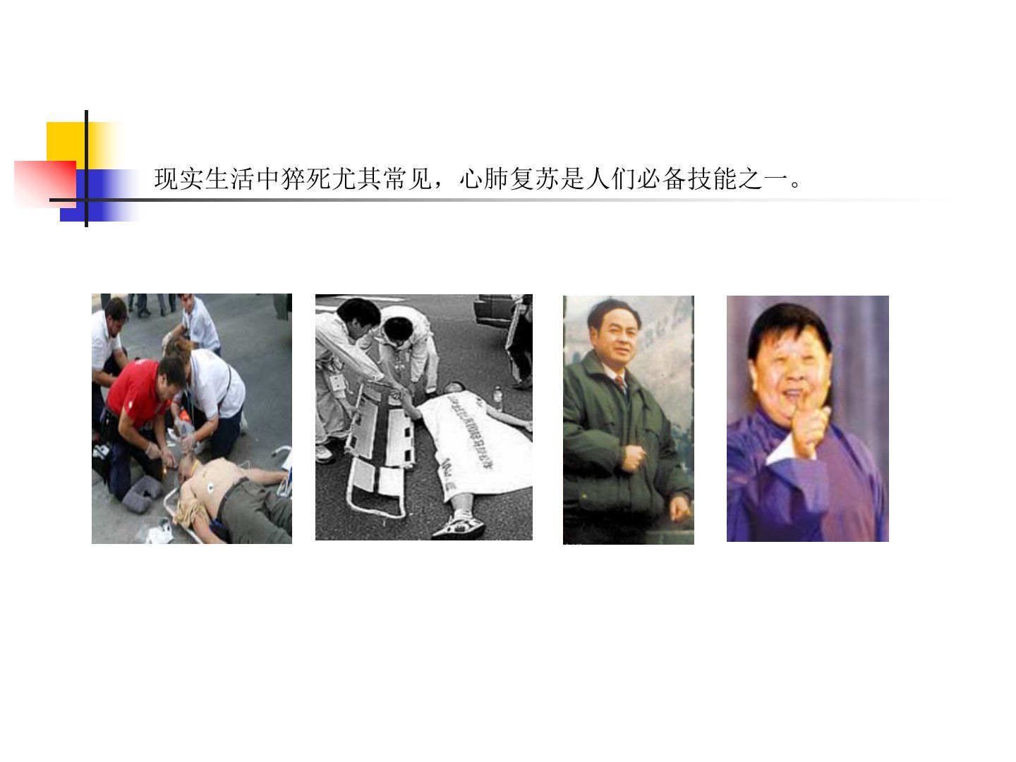 现实生活中猝死常见心肺复苏(CPR)是必备技能。心脏骤停后果严重以秒计算:10秒意识丧失30秒全身抽搐60秒自主呼吸停止3分钟后脑水肿6分钟脑细胞死亡8分钟脑死亡。心肺复苏四步战略:1判断意识:轻拍患者并大声呼叫摸颈动脉判断有无脉搏感受有无自主呼吸若无则准备心肺复苏。2胸外按压:按压时紧靠患者一侧正常形体患者按压幅度至少5cm每次按压后放松使胸骨恢复到按压前的位置按压频率至少为100次分。3气道开放:清除口中异物舌体阻塞时采用仰头开口、托颌法开放气道。4人工呼吸:确保气道通畅捏住鼻孔每次吹气持续1秒确保胸廓起伏胸外按压与通气比例为302循环5次若无复苏迹象则继续实施有效标志为瞳孔缩小、恢复自主呼吸、口唇红润。