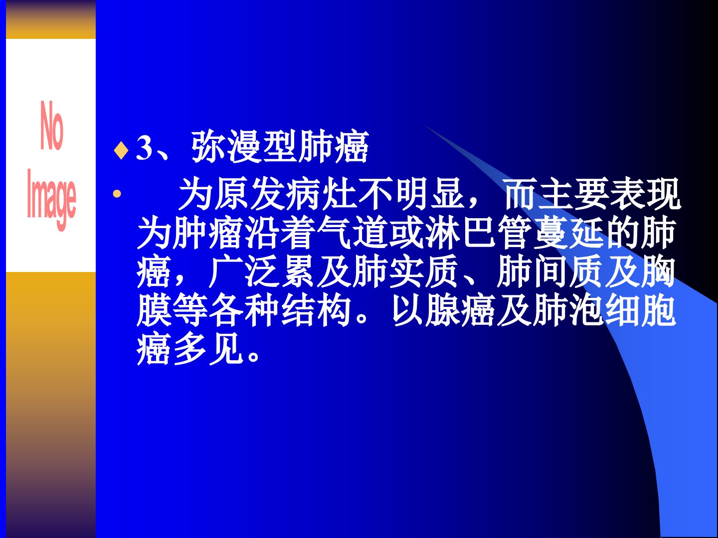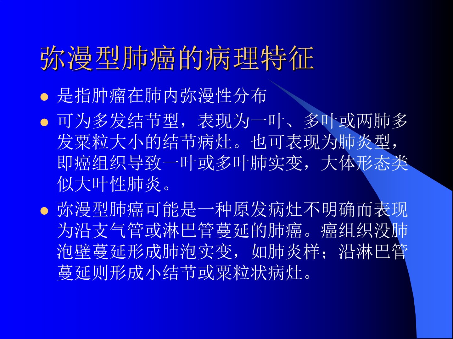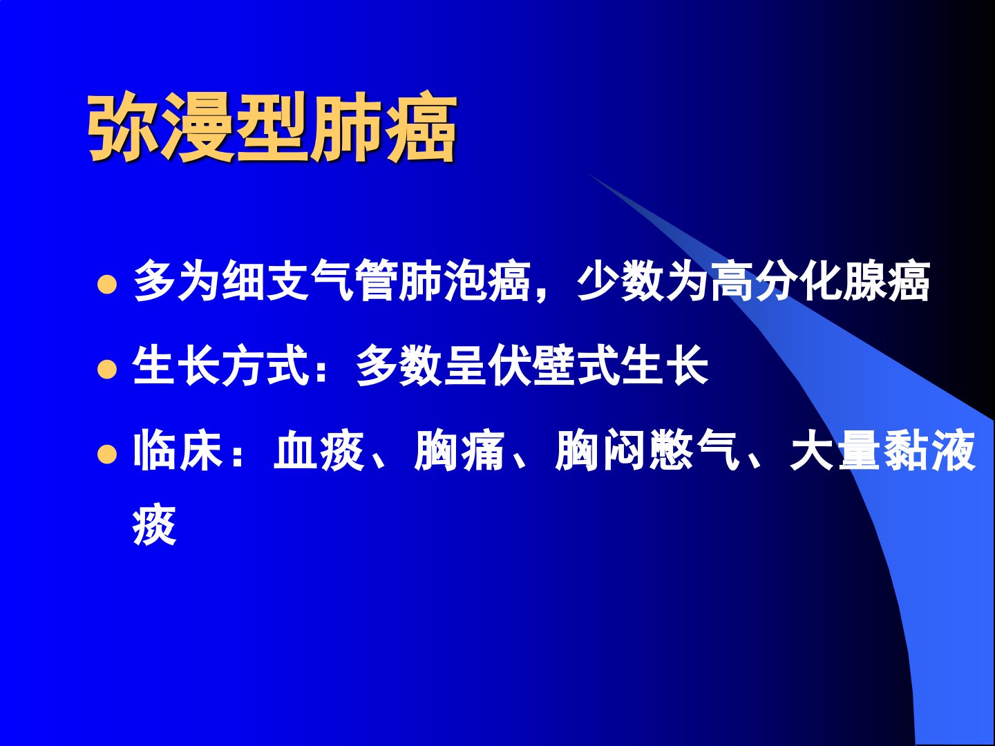 弥漫型肺癌原发病灶不明显主要表现为肿瘤沿气道或淋巴管蔓延广泛累及肺实质、肺间质及胸膜等结构以腺癌及肺泡细胞癌多见多为细支气管肺泡癌少数为高分化腺癌多呈伏壁式生长。临床表现为血痰、胸痛、胸闷憋气、大量黏液痰等肿瘤在肺内弥漫性分布可为多发结节型表现为一叶、多叶或两肺多发粟粒大小结节病灶也可表现为肺炎型。X线表现多样可为双肺广泛性网状阴影及粟粒或小结节状阴影常有肺门及纵隔淋巴结增大同时有胸膜增厚或胸腔积液。细支气管肺泡癌属腺癌为周围型特殊类型X线表现有孤立肿块型、肺炎型、弥散型。特殊征象有枯枝征、CT“血管造影征”等。诊断需结合临床表现及平片、CT和MRI所见特殊病例需结合镜检和活检。肺癌合并空洞时需与结核空洞等鉴别。
