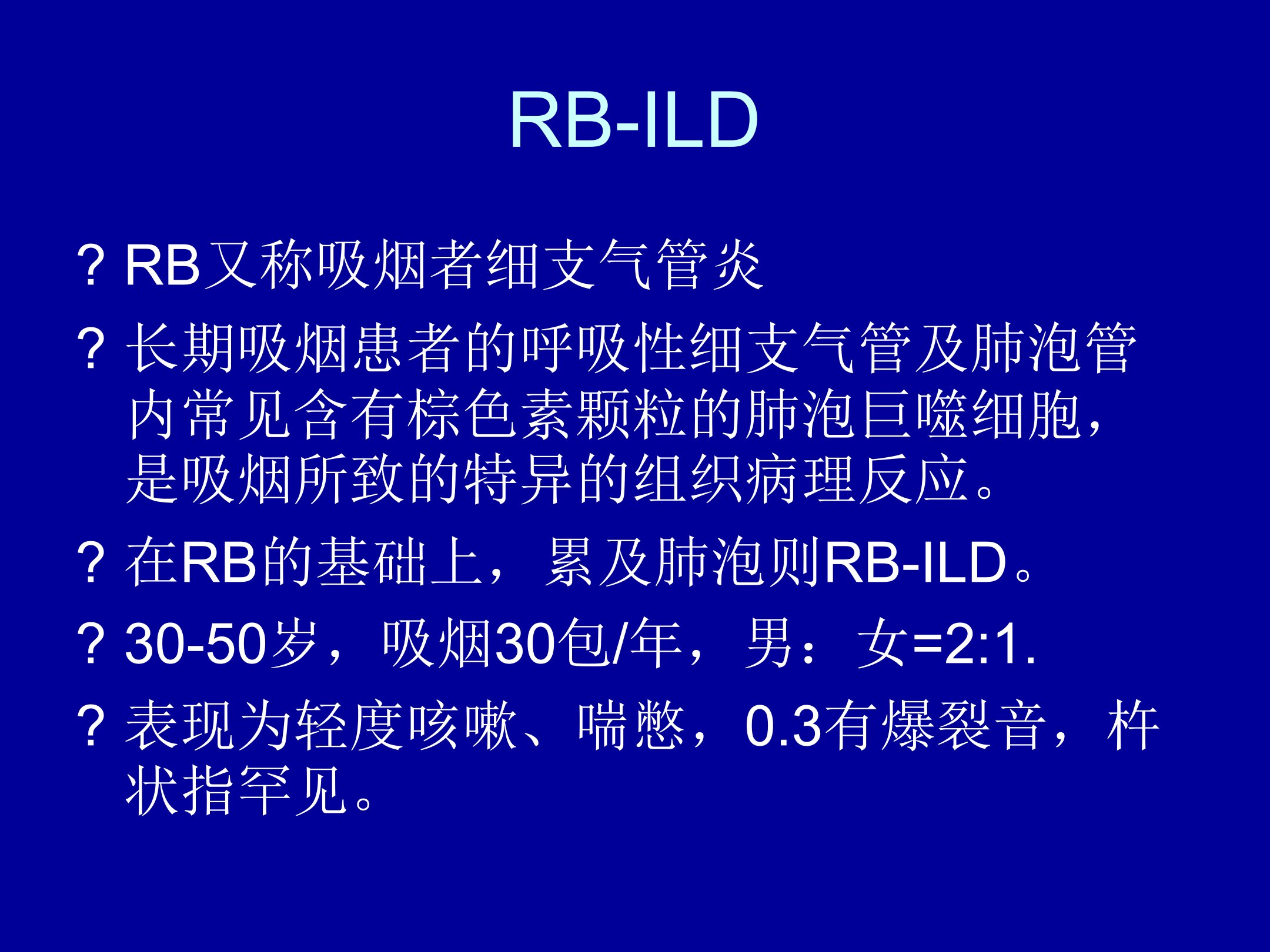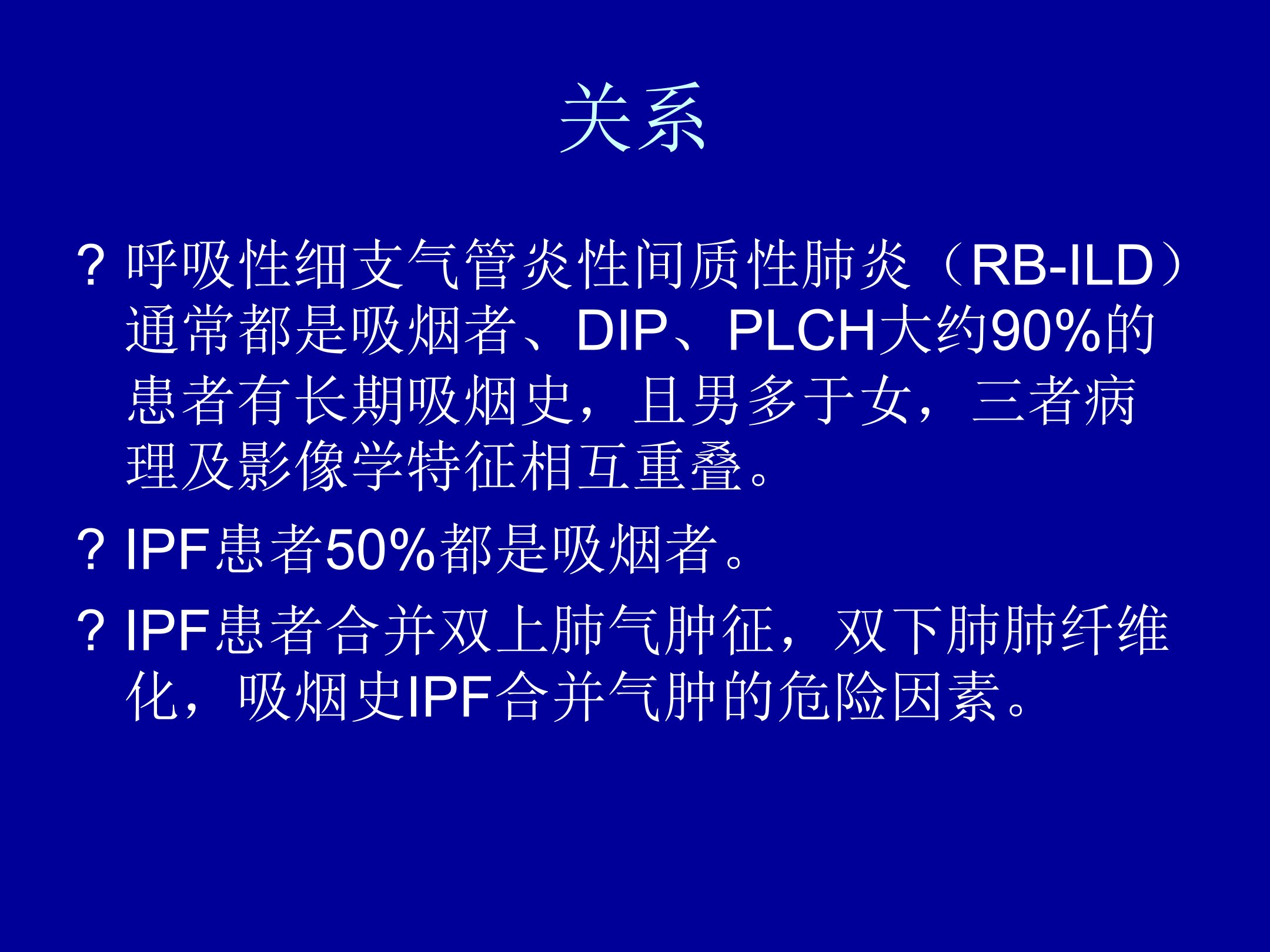 吸烟相关性间质性肺疾病包括RBILD、DIP、PLCH等均与吸烟密切相关。RBILD患者多为3050岁吸烟者病理特征为呼吸性细支气管等内巨噬细胞积聚CT示小叶中心性结节戒烟及糖皮质激素治疗有效预后好。DIP患者年龄4050岁90为吸烟者病理改变以肺泡腔内巨噬细胞聚集为主CT示双下肺毛玻璃影戒烟及激素治疗有效预后优于IPF。PLCH患者90为吸烟者病理以细支气管为中心的星状结节及囊腔CT早期示小叶中心性结节晚期示囊腔戒烟后病情可稳定口服激素可控制症状但预后不一。RB、RBILD、DIP或为同一疾病不同阶段但被归为IIP的两个亚型。病变部位上RBILD以呼吸性细支气管为主DIP以肺泡腔为主PLCH累及细支气管后期扩张为囊样变。CT表现上RBILD示小叶中央型结节DIP示毛玻璃样变PLCH则时相不均一结节、纤维灶及囊腔样变共存。