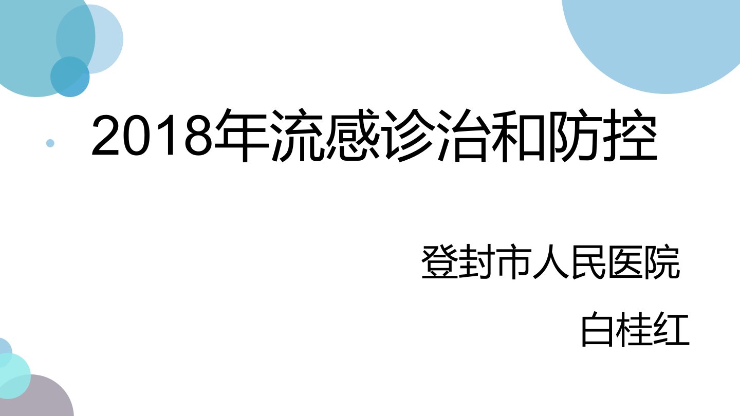 2018年流感诊治和防控摘要本文为登封市人民医院白桂红关于2018年流感诊治和防控的综述主要内容如下:概述:流感由流感病毒引起人群普遍易感高危人群包括慢性基础病患者、孕妇、儿童、医务人员和老年人。病原学上流感病毒分为四型目前感染人的主要是甲型流感病毒中的H1N1、H3N2亚型。流感主要通过飞沫传播也可通过粘膜或接触传播。诊断和治疗:临床表现包括发热、头痛等儿童、婴幼儿症状各有特点。并发症以肺炎最常见。实验室检查包括外周血常规、血生化、流感病原学相关检查。重症病例高危人群包括儿童、老年人、慢性病患者等。诊断分临床诊断和确定诊断。治疗包括尽早隔离非住院患者居家隔离对症治疗抗病毒治疗重症病例需积极治疗原发病、防治并发症。医疗机构处置流程:以感染性疾病科等为依托履行预检、分诊等职责落实首诊负责制和分级诊疗制度。医院感染控制:管理传染源包括预检分诊、隔离患者;切断传播途径采取隔离和适宜消毒技术;保护易感人群医务人员采取防护措施陪护人员需筛查。预防:疫苗接种是最有效手段我国批准上市的流感疫苗包括三价灭活疫苗和四价灭活疫苗。药物预防作为紧急临时预防措施。一般预防措施包括保持个人卫生习惯、增强体质等。