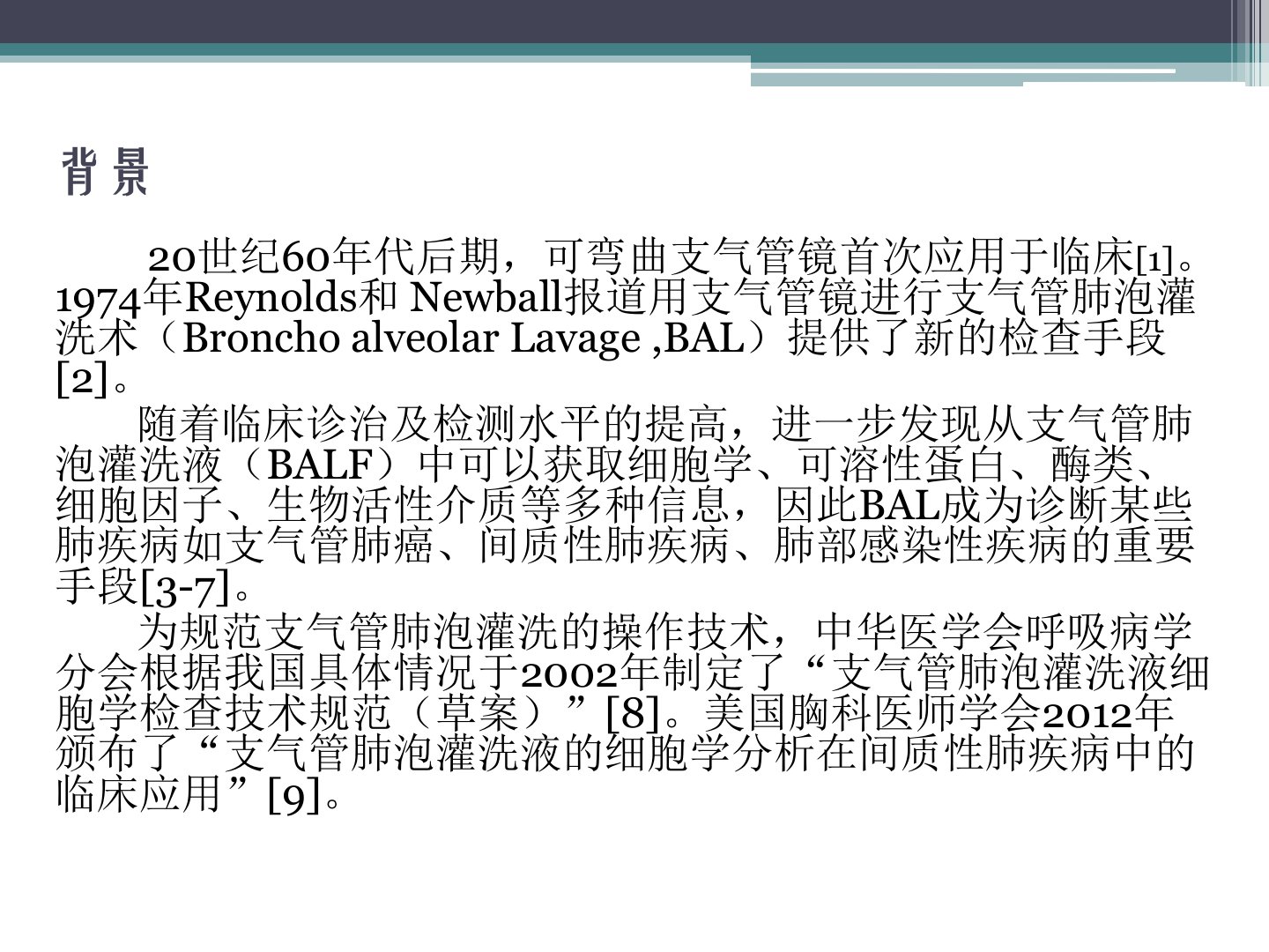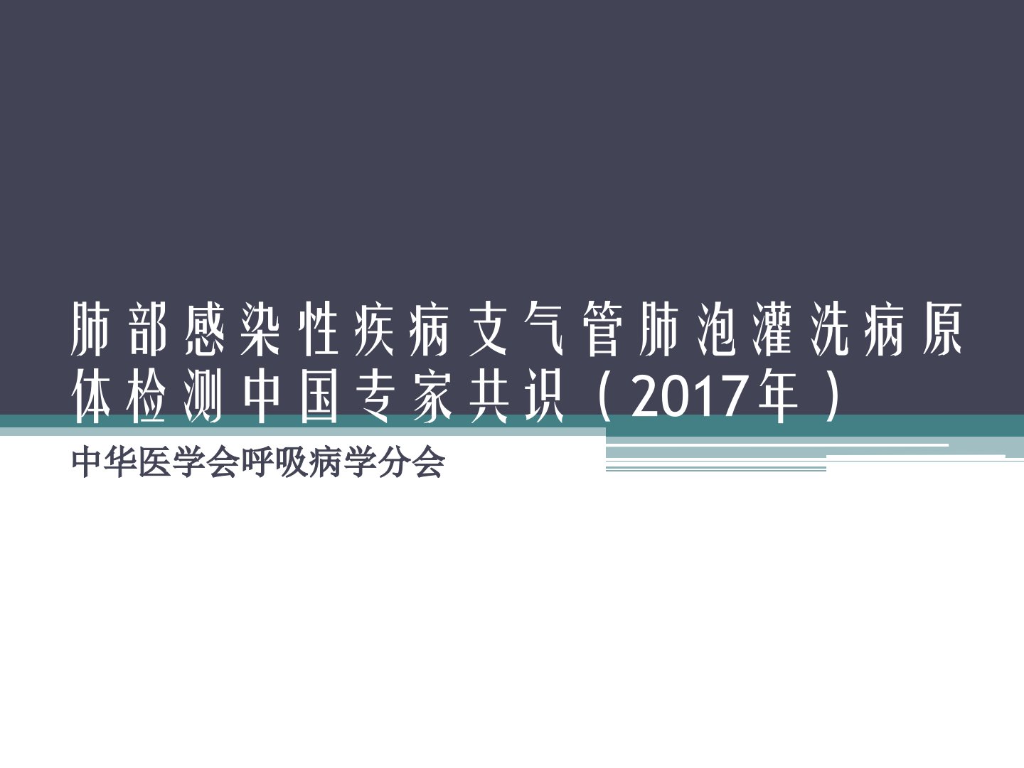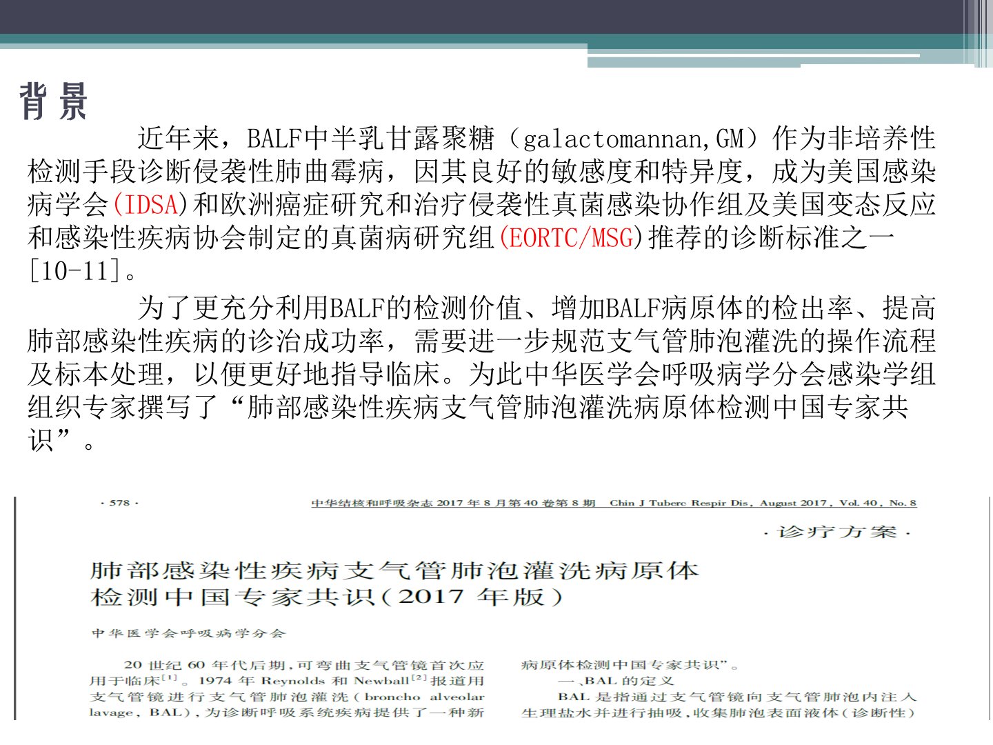 《肺部感染性疾病支气管肺泡灌洗病原体检测中国专家共识(2017年)》摘要20世纪60年代后期可弯曲支气管镜首次应用于临床1974年支气管镜用于支气管肺泡灌洗术(BAL)BALF可提供细胞学等多种信息成为诊断多种肺疾病的重要手段。为规范操作中华医学会呼吸病学分会制定了相关技术规范。近年来BALF中半乳甘露聚糖(GM)成为诊断侵袭性肺曲霉病的推荐标准之一。为提高肺部感染性疾病诊治成功率中华医学会呼吸病学分会感染学组组织专家撰写了本共识。共识内容包括:定义、适应症、禁忌症:适用于诊断性BAL用于免疫受损患者等病原体诊断。禁忌症包括严重通气功能障碍、急性冠脉综合征等。操作流程:包括术前准备、灌洗操作、注意事项等。标本送检:需用无菌容器室温2h内送至微生物实验室。并发症:相对安全有支气管痉挛等并发症。临床意义:微生物学涂片、培养对病原体检测有重要意义灌洗液中GM测定对诊断侵袭性肺曲霉病有价值细胞学分类可辅助诊断。常见问题说明:包括灌洗部位、灌洗液量、吸引负压等选择及标本预处理、储存转运等。BALF标本病原体实验室检测:包括显微镜检查、培养、核算检测、真菌抗原检测等。