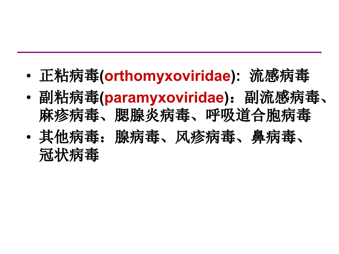 第二十六章呼吸道病毒摘要呼吸道病毒涵盖多类病毒本章重点介绍了几种重要的呼吸道病毒:1正粘病毒流行性感冒病毒:可感染人和动物分甲、乙、丙三型。甲型易变异易引起大流行;乙型常局部爆发;丙型主要侵犯婴幼儿。病毒结构包括核心、包膜等包膜上有血凝素(HA)和神经氨酸酶(NA)两种刺突。病毒通过飞沫经呼吸道侵入机体引起全身症状。防治方面可接种灭活和减毒活疫苗使用盐酸金刚烷胺等药物。禽流感病毒属甲型流感病毒部分亚型(如H5N1)感染人后病情重、病死率高。2副粘病毒麻疹病毒:麻疹的病原体呈球形有包膜只有一个血清型。通过飞沫传播首先在呼吸道上皮细胞内增殖然后进入血流形成病毒血症。自然感染后可获得牢固免疫力。预防可接种麻疹减毒活疫苗。3冠状病毒和SARS冠状病毒:单正链RNA病毒主要引起普通感冒和咽喉炎SARS冠状病毒为新的冠状病毒。4腮腺炎病毒:流行性腮腺炎病原体通过飞沫等传播引起腮腺肿大病后获得终生免疫。美国等国家采用MMR三联疫苗进行免疫接种。5风疹病毒:人是唯一自然宿主妊娠早期感染易引起垂直传播和胎儿畸形减毒活疫苗常与麻疹、腮腺炎组合成三联疫苗MMR使用。6呼吸道合胞病毒:引起婴幼儿下呼吸道疾病的