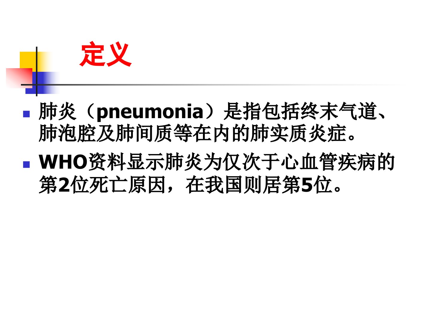 呼吸系统疾病肺炎摘要本文概述了肺炎的定义、分类、病因、临床表现、诊断、治疗及预防。肺炎指包括终末气道、肺泡腔及肺间质等在内的肺实质炎症为第2位死亡原因在我国则居第5位。分类包括解剖分类(大叶性、小叶性、间质性肺炎)和病因分类(细菌性、病毒性、非典型病原体、真菌性等)。社区获得性肺炎(CAP)和医院内获得性肺炎(HAP)是两种主要患病环境分类。临床表现上肺炎常见症状为咳嗽、咳痰、胸痛、呼吸困难和发热。诊断需区分上呼吸道感染和其他类似肺炎的疾病并评估严重程度。治疗以抗感染为主根据病原体和病情选择合适的抗菌药物如青壮年CAP常用青霉素类老年人或需住院的CAP则选用氟奎诺酮类等。细菌性肺炎中肺炎球菌肺炎占CAP的50首选青霉素治疗。葡萄球菌肺炎、克雷白杆菌肺炎等则需根据具体情况选择抗生素。预防方面建议加强体育锻炼、减少危险因素特定人群可注射流感疫苗和肺炎疫苗。