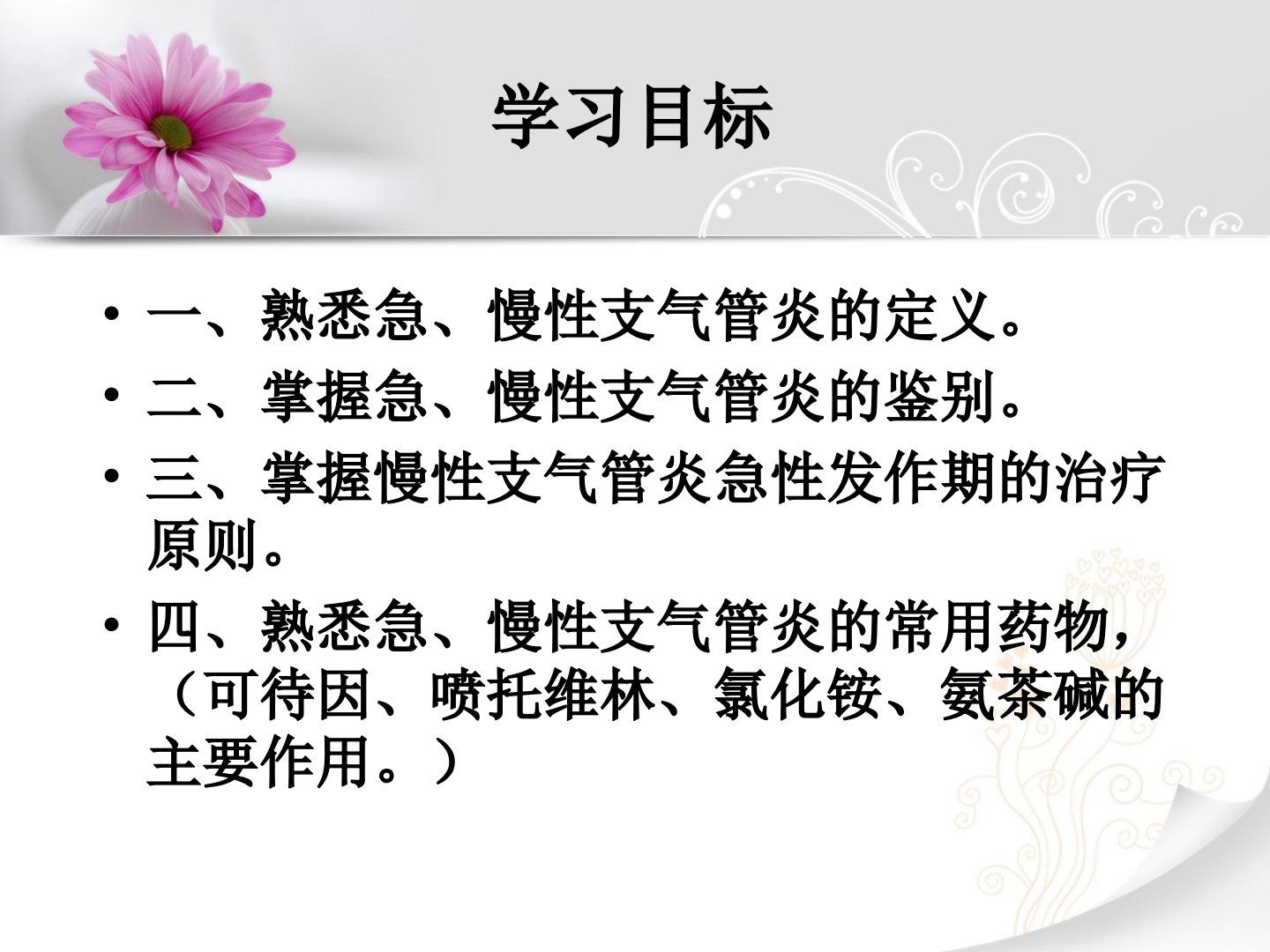 作为医生需掌握急、慢性支气管炎相关知识学习目标包括:一、熟悉急、慢性支气管炎定义急性支气管炎是气管、支气管粘膜的急性炎症慢性支气管炎则是气管、支气管粘膜及周围组织的慢性炎症多见于50岁以上患者;二、掌握两者鉴别通过询问咳嗽起始时间、变化、痰液性质等进行问诊;三、掌握慢性支气管炎急性发作期治疗原则包括控制感染、祛痰止咳、解痉平喘;四、熟悉常用药物如可待因(适用于无痰性干咳但长期服用可成瘾痰多者禁用)、喷托维林(非成瘾性镇咳药)、氯化铵(利于粘痰清除)、氨茶碱(松弛呼吸道平滑肌)。治疗上急性支气管炎需适当休息、饮食对症治疗发热头痛、咳嗽等症状并在医生指导下控制感染;慢性支气管炎急性发作期同样需控制感染、祛痰止咳、解痉平喘缓解期则要提高机体抵抗力。中药治疗方面不同药物适用于不同症型咳嗽。建议避免物理因素刺激、增强体质、多饮水。感冒与急性支气管炎以主证区分。作业涉及治疗原则、问诊症状、发病年龄及药物选择。此外单方验方、非药物疗法如药物熏蒸、贴敷、中药超声雾化、足浴等也有一定疗效。
