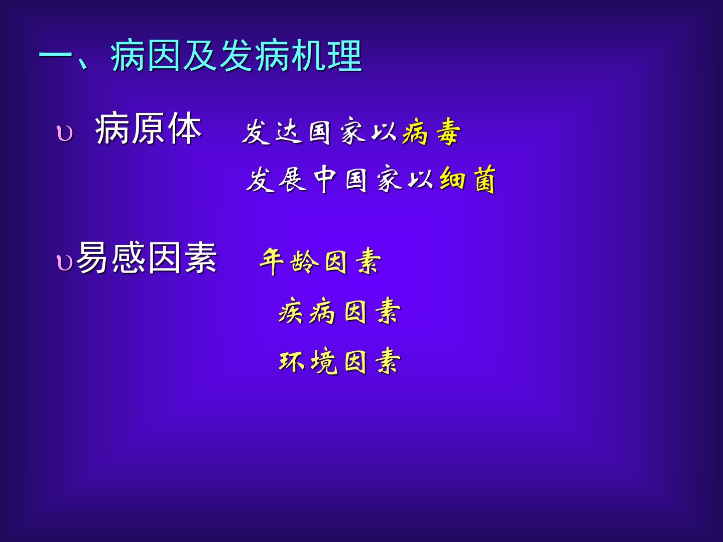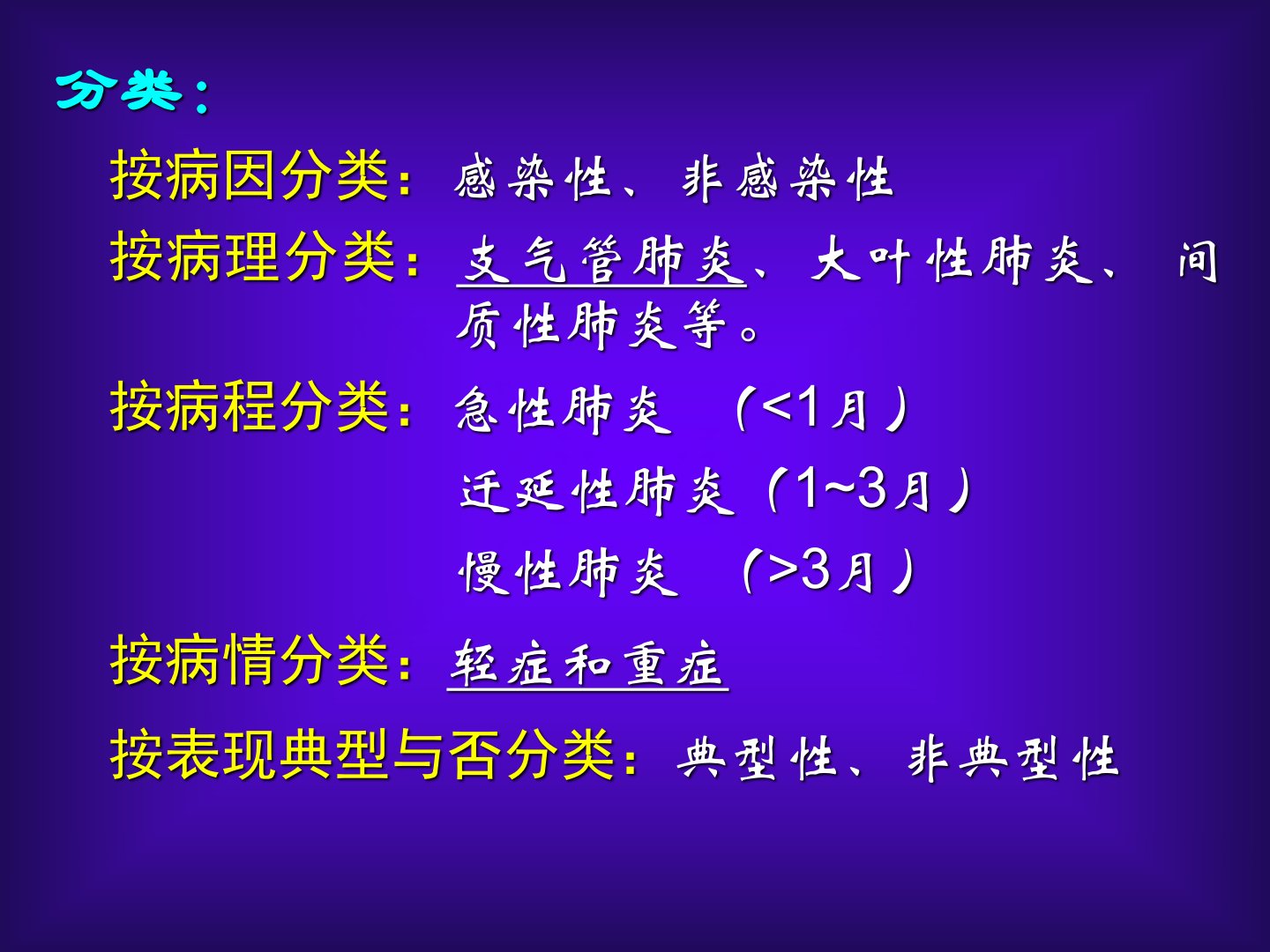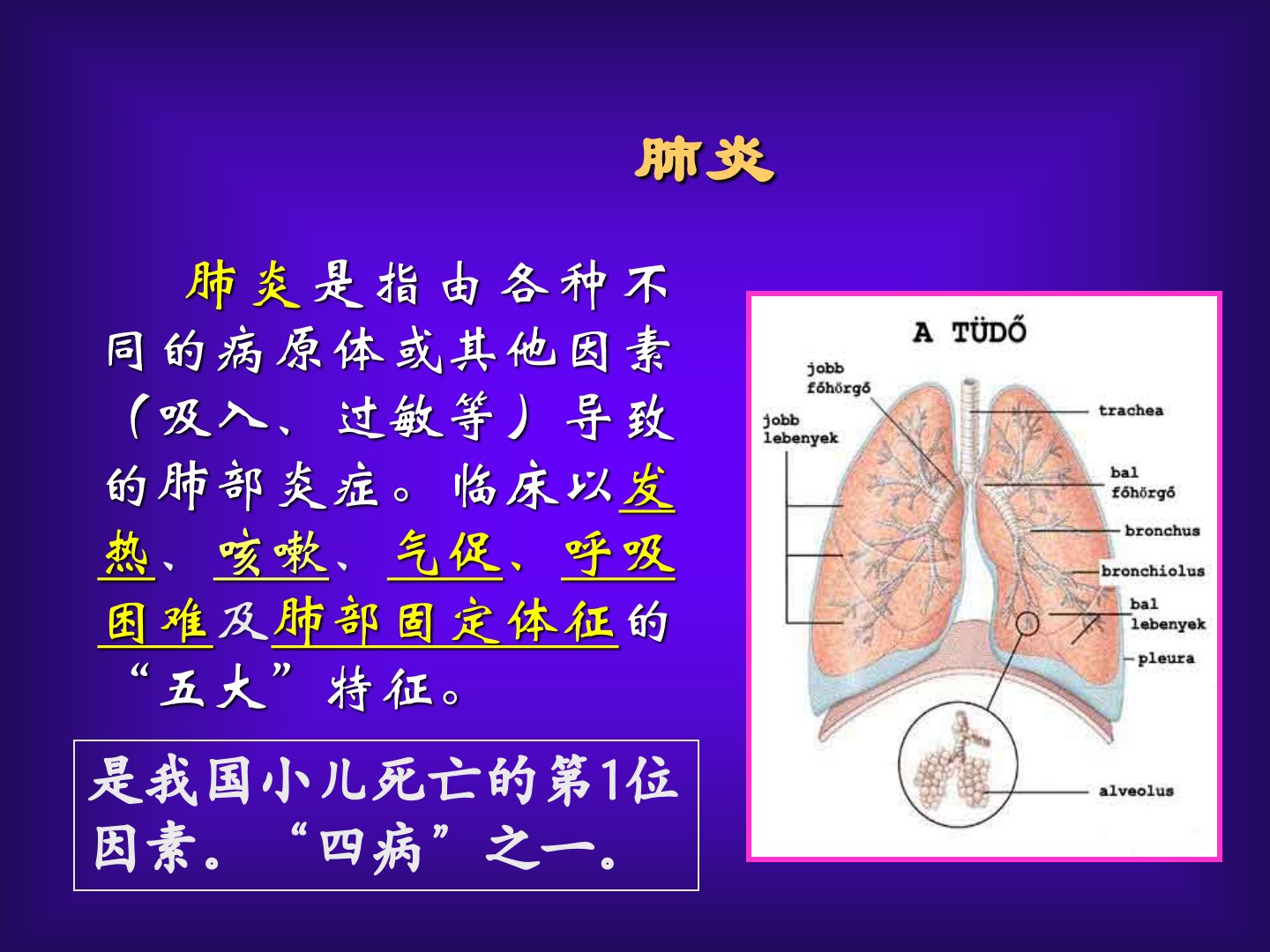 肺炎是由多种病原体或因素引发的肺部炎症表现为发热、咳嗽等症状是我国小儿死亡的首位因素。“四病”之一。其分类多样病因上分感染性、非感染性病理上分支气管肺炎、大叶性肺炎等还有按病程、病情、表现典型与否等多种分类方式。发病机理涉及通气、换气障碍导致低氧血症等。临床表现上支气管肺炎轻症以呼吸系统症状为主重症则有全身中毒症状甚至引发心力衰竭等。并发症常见有脓胸等。治疗原则主要是抗感染与对症治疗重症需早期、联合、足量、足疗程用药。护理方面包括一般护理如环境调整、饮食管理等对症护理如保持呼吸道通畅、氧疗法等还有用药护理需遵循早期、联合等原则。同时要对患者及家属进行健康教育介绍肺炎知识、指导休息、喂养、用药等。