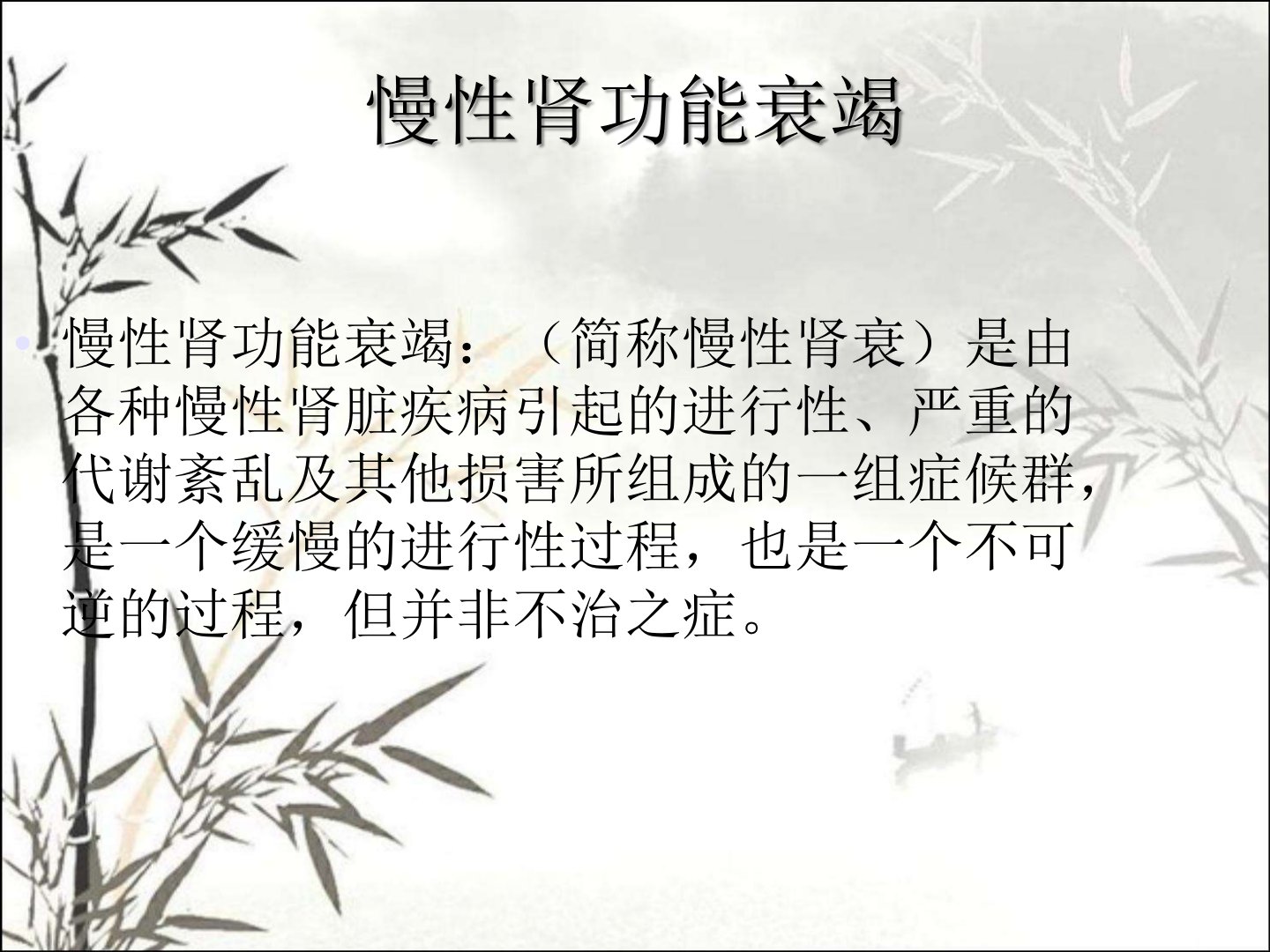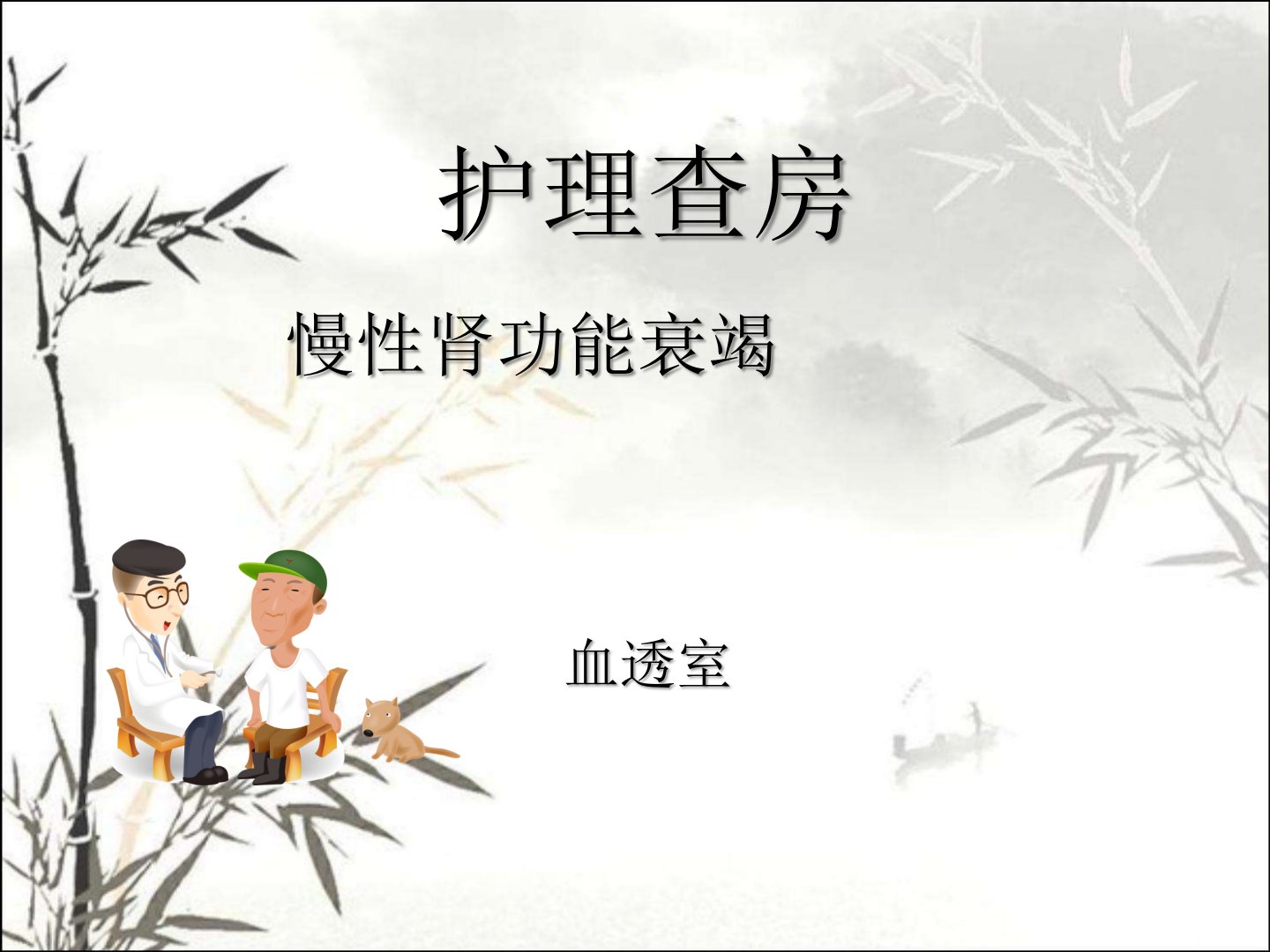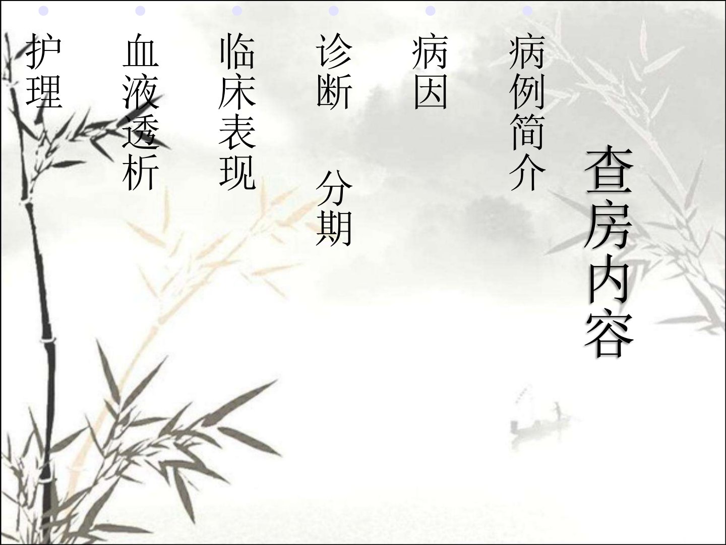 护理查房摘要:慢性肾功能衰竭血透室查房本次查房聚焦慢性肾功能衰竭(简称慢性肾衰)及其血液透析护理。慢性肾衰由多种慢性肾脏病引发呈进行性、不可逆发展但并非不治之症。病例为32岁男性孙斌2004年确诊慢性肾炎2005年开始血液透析规律透析10年余。近期检查显示多项指标异常消化系统有尿毒症性口腔炎等表现;心血管系统易出现高血压、心肌病等;呼吸系统因贫血及酸中毒呼吸异常;造血系统显著贫血且有出血倾向;精神神经系统有记忆力减退等表现;皮肤与粘膜有黑色素沉着等问题;还伴有水、电解质、酸碱平衡紊乱。血液透析利用半透膜原理清除毒素、多余水分调节电解质及酸碱平衡。动静脉内瘘是血透患者“生命线”使用时要注意时机、穿刺部位日常要做好维护。护理诊断包括感染危险、低血压等低血压应急预案已明确。血透病人饮食需高蛋白、高钙、低钾、低磷、低钠并控制水分摄入。患者社会支持来源广泛家庭成员支持尤为重要应做好家属教育工作。
