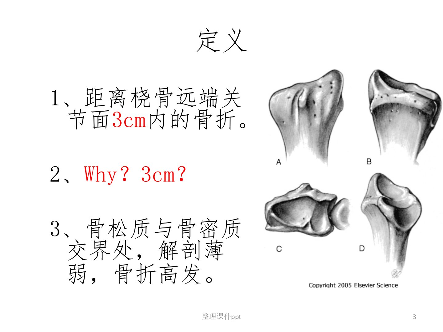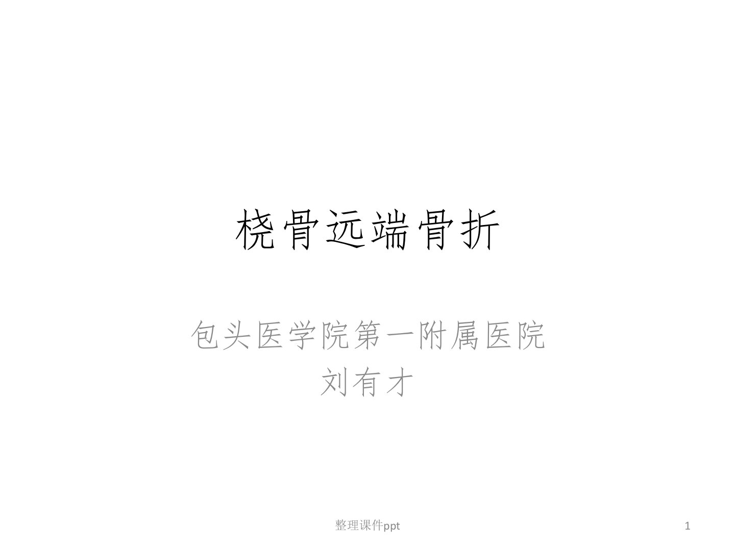 桡骨远端骨折整理课件摘要包头医学院第一附属医院刘有才整理了桡骨远端骨折相关资料。桡骨远端骨折指距离桡骨远端关节面3cm内(骨松质与骨密质交界处解剖薄弱为骨折高发区)的骨折是常见骨折之一约占所有骨折的16老年人多为低能量损伤年轻人患者多为高能量损伤。X线评估指标包括掌倾角、尺偏角、桡骨高度等。骨折类型有Colles、smith、barton骨折等AO分型分为A、B、C三型并细分为A1A3、B1B3、C1C3。骨折复位有理想与可接受标准。治疗方面开放复位内固定影像学结果更好有利于早期关节活动的恢复但关节运动范围没有显著区别且尚无最佳治疗方法。并发症包括急诊期(血管、正中神经损伤等)、早期(6周如石膏相关并发症、复位丢失等)和远期(6周后如神经损伤症状及疼痛综合症、创伤性关节炎等)。