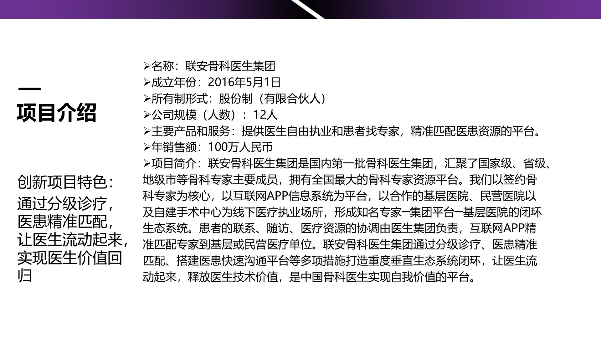 联安骨科医生集团成立于2016年5月1日为股份制有限合伙人公司现12人专注健康产业创新。作为国内首批骨科医生集团它汇聚了多级骨科专家拥有全国最大的骨科专家资源平台。集团以签约骨科专家为核心依托互联网APP信息系统联合基层医院、民营医院及自建手术中心构建了知名专家集团平台基层医院的闭环生态系统。通过分级诊疗和医患精准匹配实现了医生资源的优化配置和价值回归。集团创新点显著通过“医生集团互联网保险”模式与知名专家签约提供手术、会诊等服务并实现了医疗服务过程的电子化、信息化管理。其创新性体现在营销、组织理念和服务模式上如弱化医院角色、专家股权参股、打造顶级骨科专家团队等。实践中医生收入增加患者就医体验改善社会服务成本下降地方医院诊治率提高。目前集团已在全国多地试点未来计划推广至全国建立综合性平台吸引更多医生加入与医院合作形成产业生态链。联安骨科医生集团为分级诊疗、医生自由执业提供了可借鉴范本。