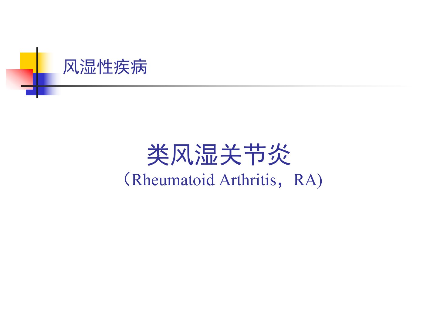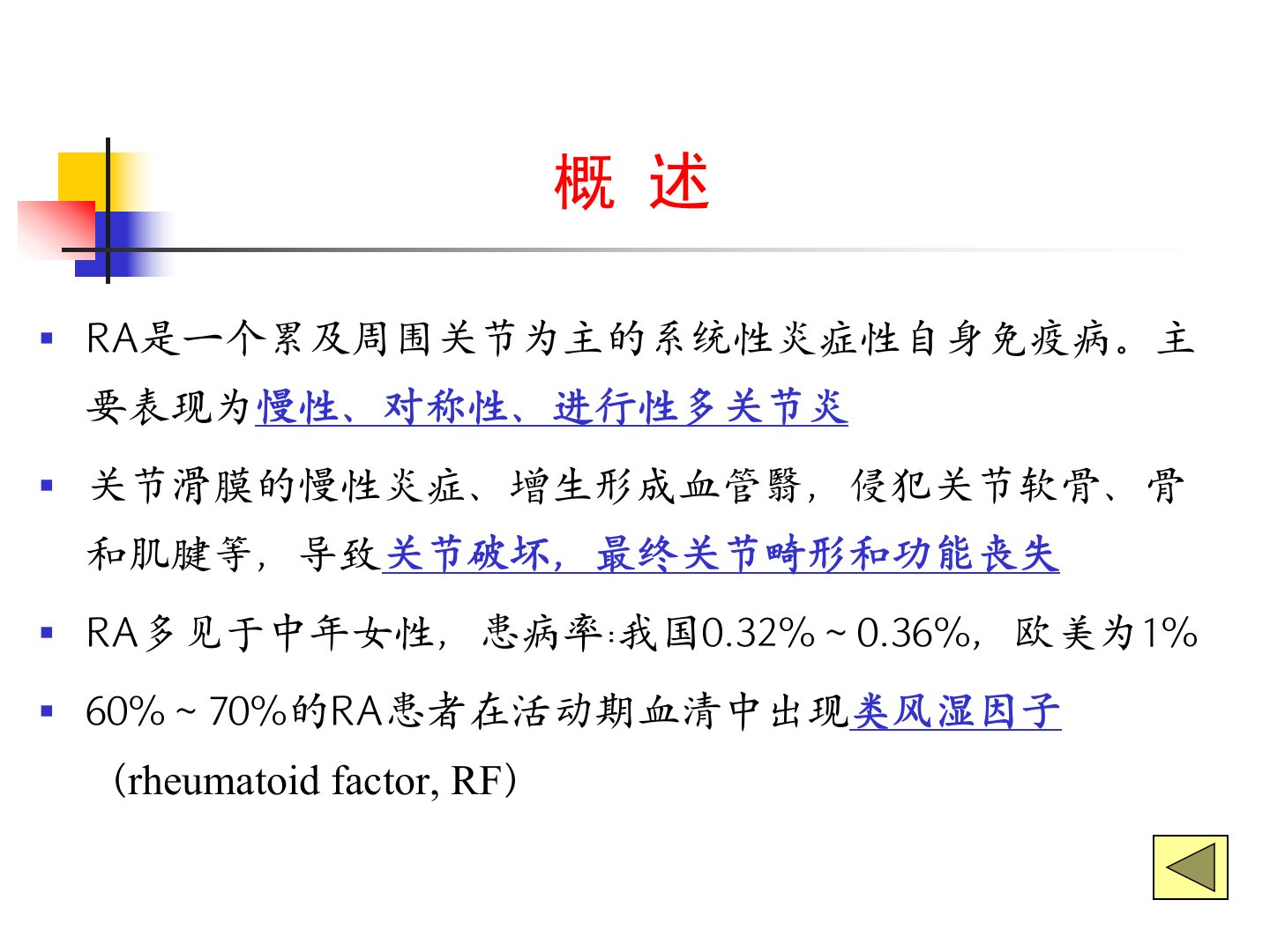 风湿性疾病类风湿关节炎(RheumatoidArthritis,RA)讲授主要内容概述病因发病机制病理临床表现实验室和其他检查诊断标准鉴别诊断治疗RA是一个累及周围关节为主的系统性炎症性自身免疫病。主要表现为慢性、对称性、进行性多关节炎关节滑膜的慢性炎症、增生形成血管翳,侵犯关节软骨、骨和肌腱等,导致关节破坏,最终关节畸形和功能丧失RA多见于中年女性,患病率:我国0.32%~0.36%,欧美为1%60%~70%的RA患者在活动期血清中出现类风湿因子(rheumatoidfactor,RF)概述尚不完全清楚(一)感染因子:改变滑膜细胞或淋巴细胞基因表达活化B细胞、T细胞和巨噬细胞,释放细胞因子分...