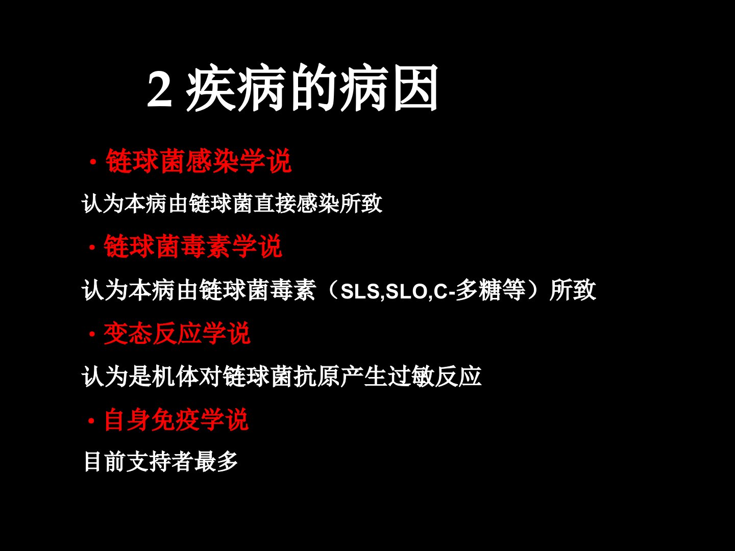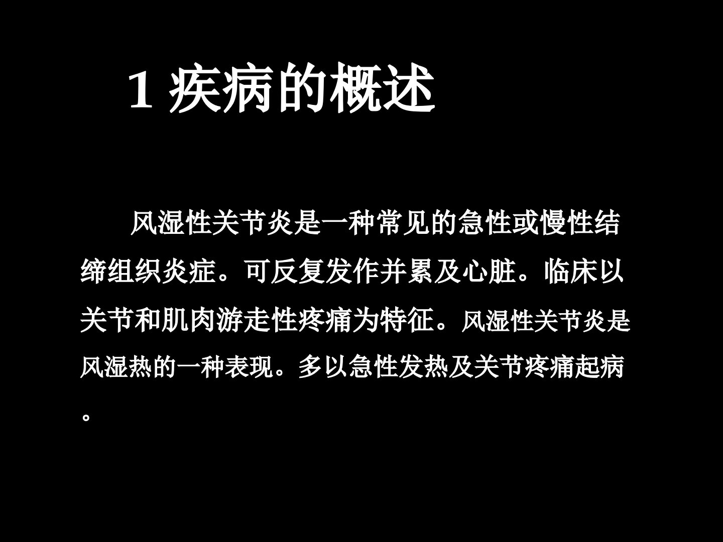 风湿性关节炎当前你正在浏览到的事第一页PPTT,共二十六页。风湿性关节炎是一种常见的急性或慢性结缔组织炎症。可反复发作并累及心脏。临床以关节和肌肉游走性疼痛为特征。风湿性关节炎是风湿热的一种表现。多以急性发热及关节疼痛起病。1疾病的概述当前你正在浏览到的事第二页PPTT,共二十六页。2疾病的病因·链球菌感染学说认为本病由链球菌直接感染所致·链球菌毒素学说认为本病由链球菌毒素(SLS,SLO,C-多糖等)所致·变态反应学说认为是机体对链球菌抗原产生过敏反应·自身免疫学说目前支持者最多当前你正在浏览到的事第三页PPTT,共二十六页。发病机制最新研究OPG/RANKL/RANK信号通路OPG——护骨...